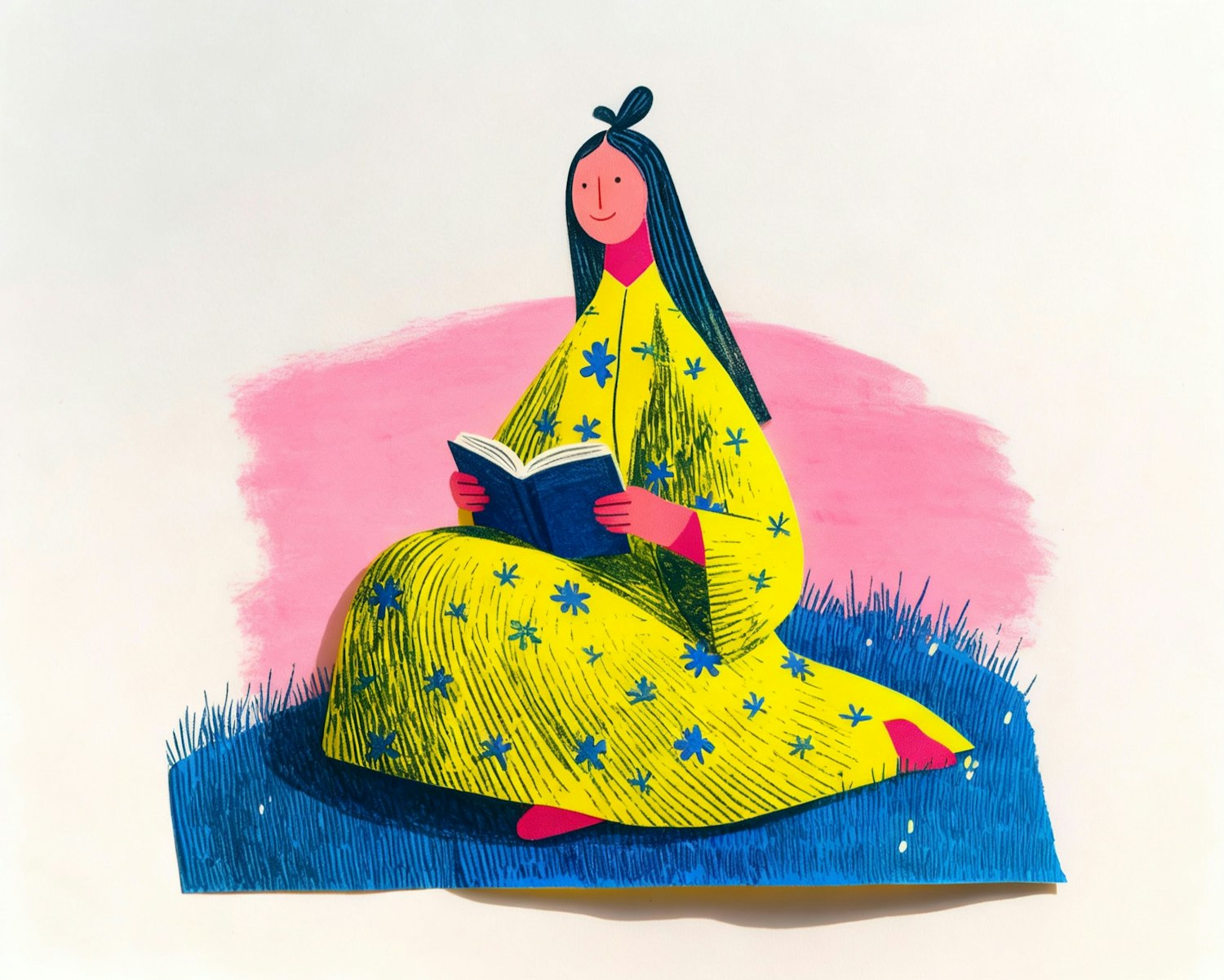 A colorful illustration of a person reading a book, wearing a yellow floral dress, sitting on blue grass with a pink background.