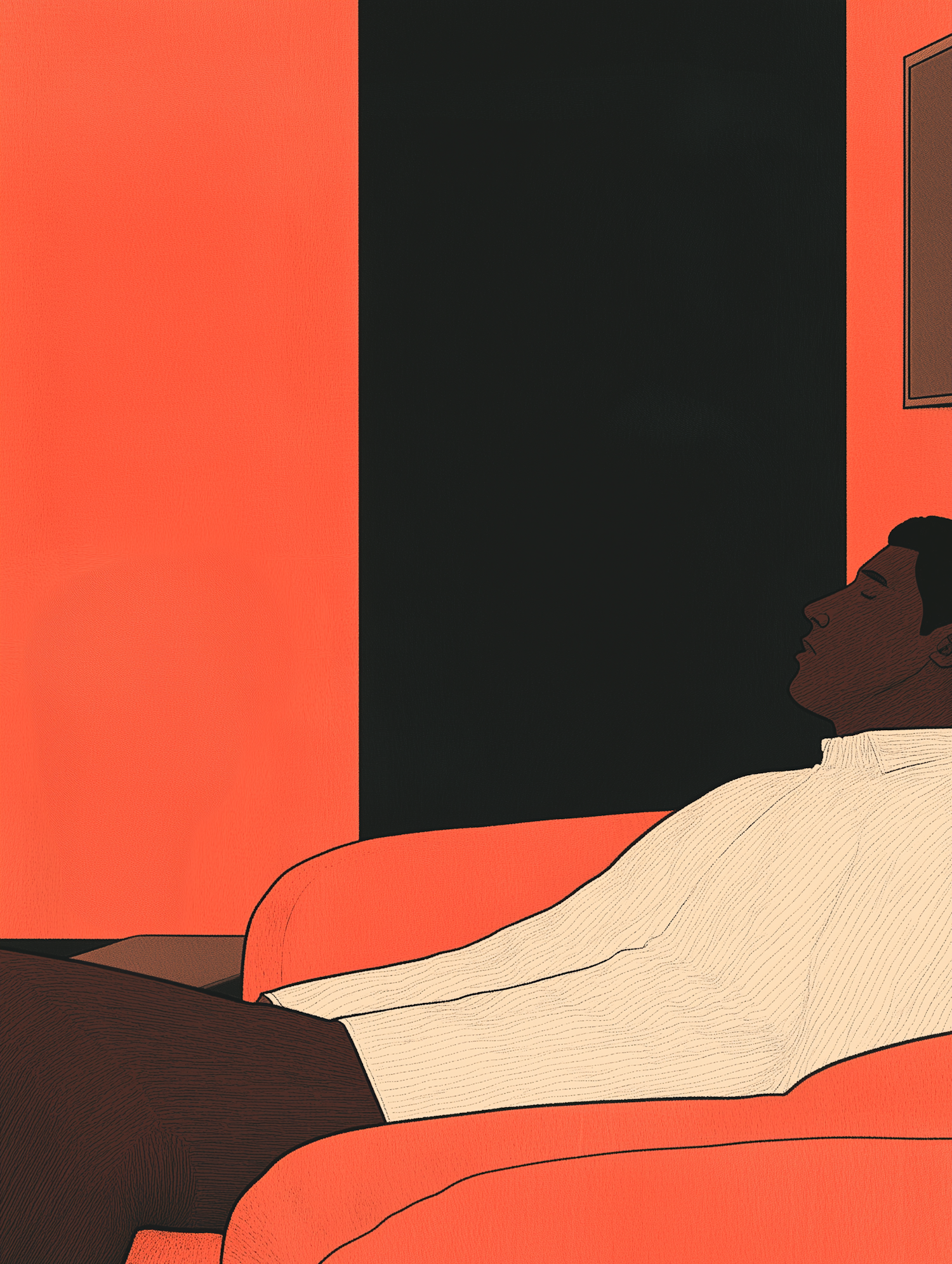 Minimalist illustration of a man relaxing in an orange chair against a bold black and orange background.