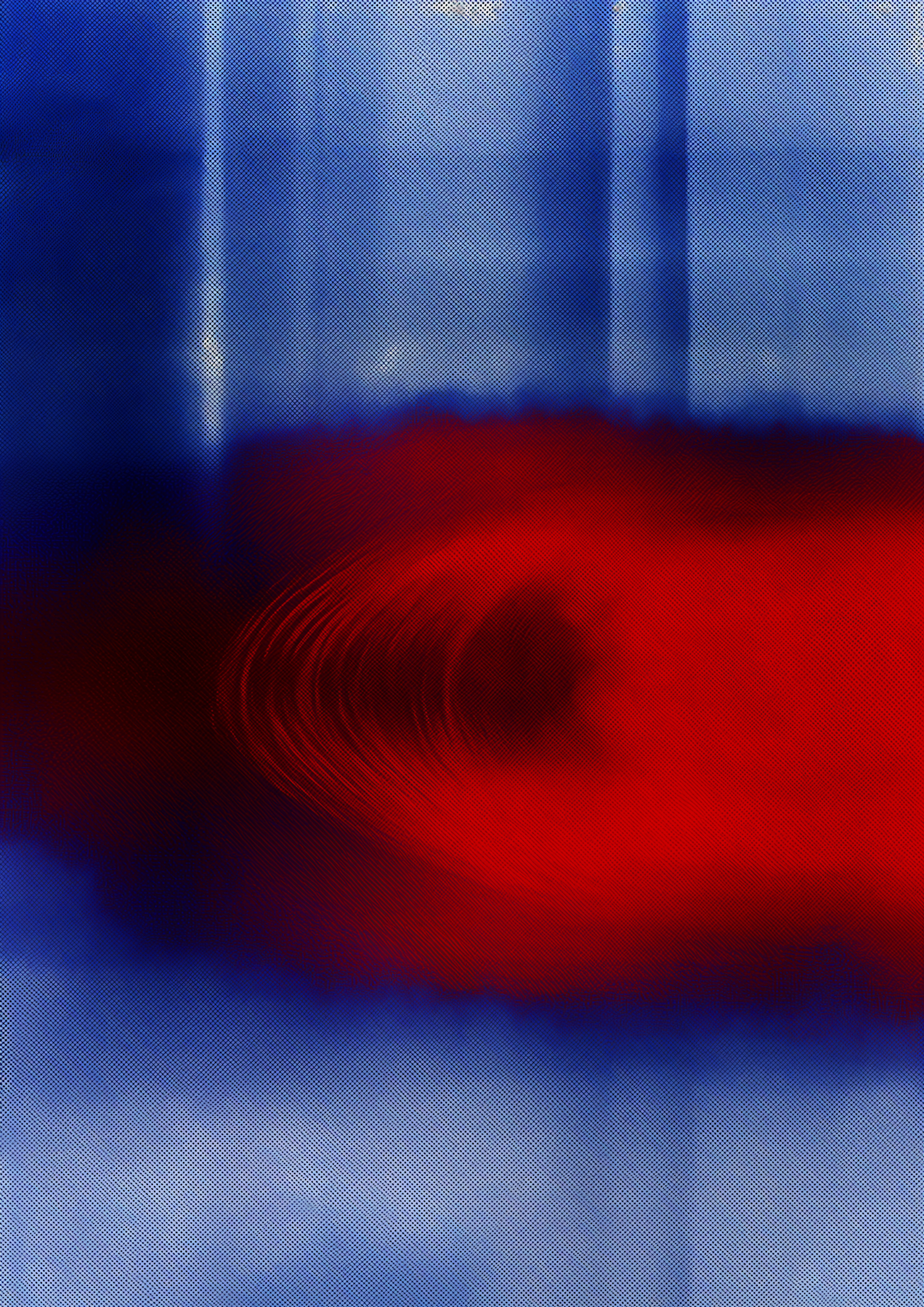 Abstract art with bold red and blue hues, swirling patterns, and a textured halftone effect. A dynamic and vibrant visual composition.