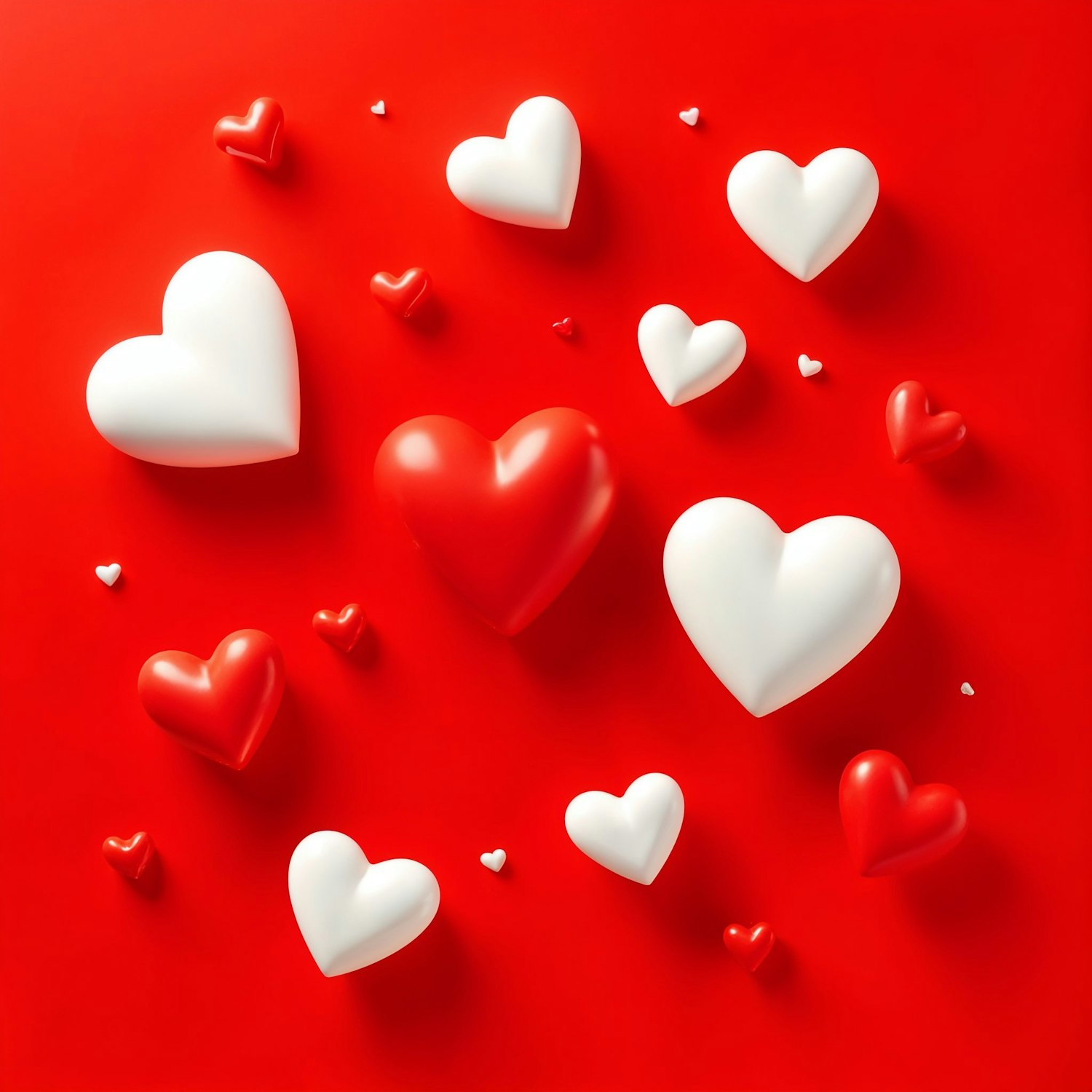 Playful red and white 3D hearts scattered on a bold red background, perfect for Valentine's Day or romantic themes.