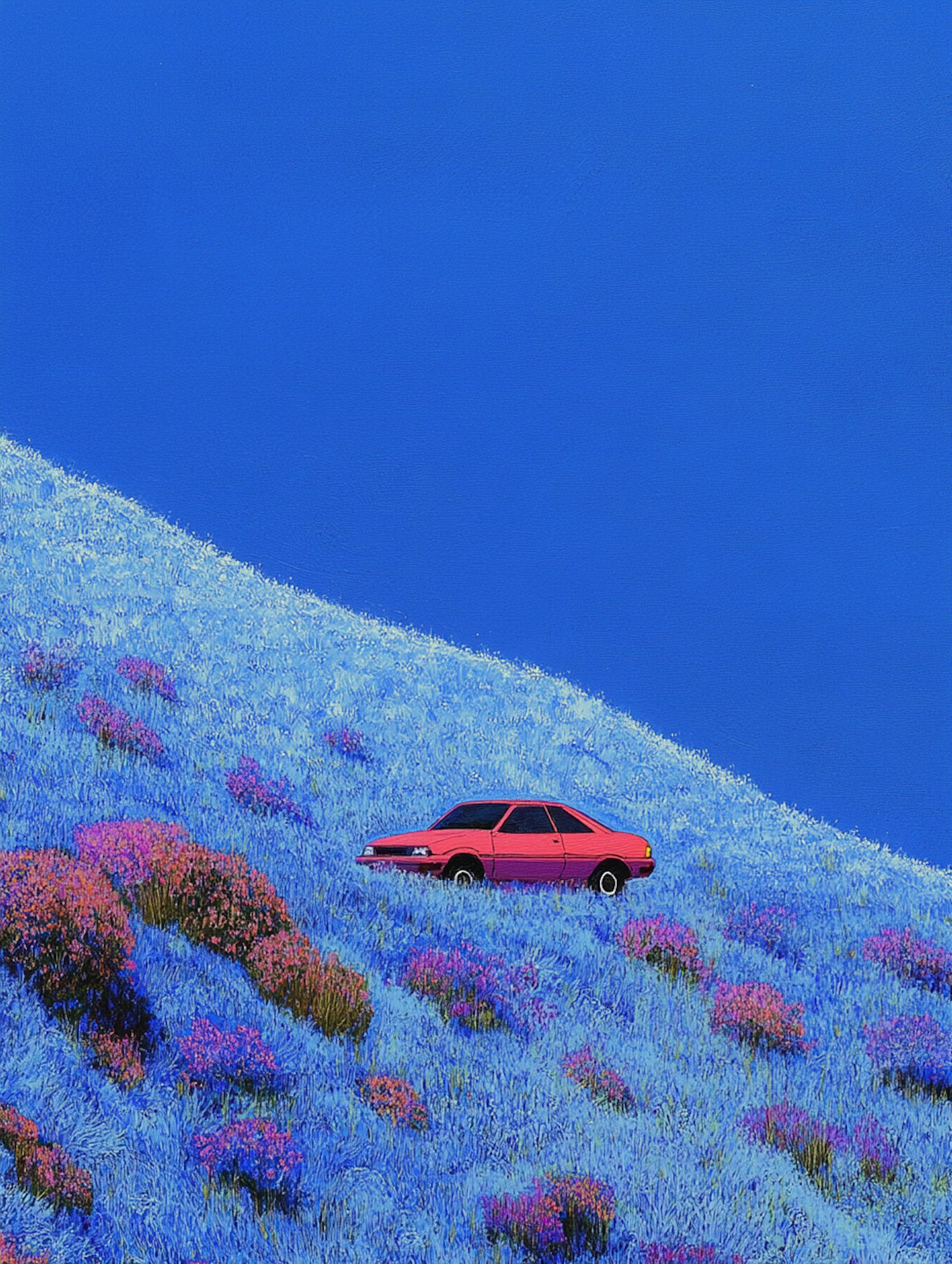 A red car on a surreal blue hill with pink and purple flowers under a deep blue sky. Bold colors create a dreamlike, minimalist vibe.