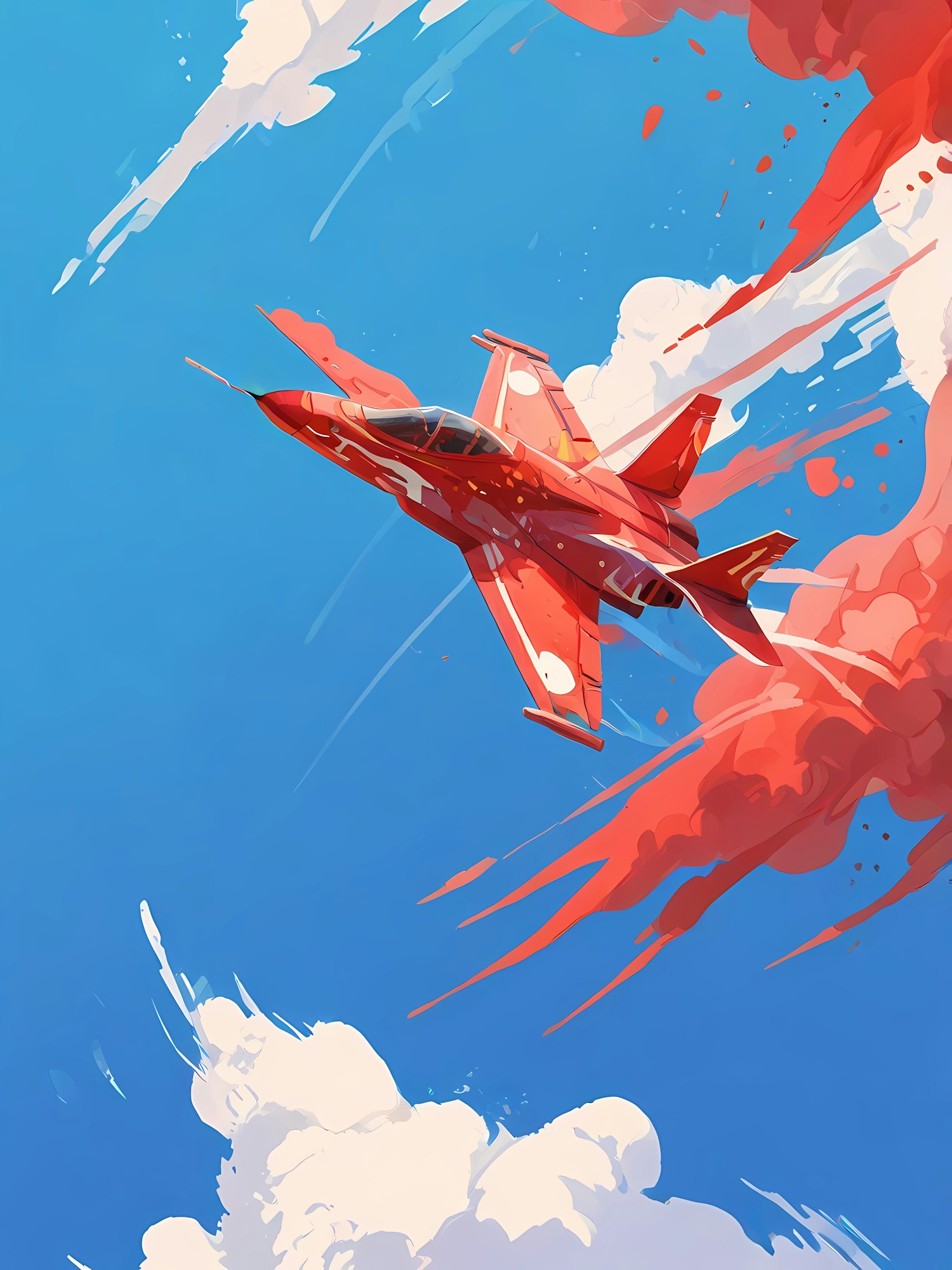 Dynamic illustration of a red fighter jet with smoke trails against a bright blue sky and scattered clouds. Bold and energetic design.