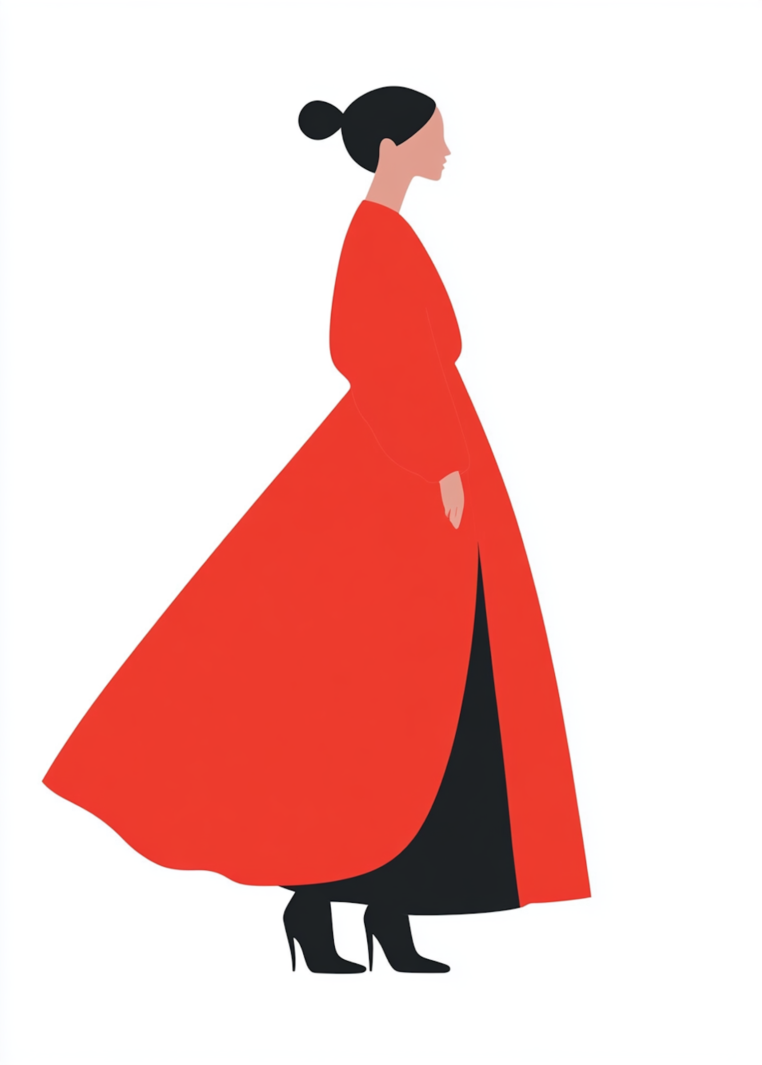Minimalist illustration of a woman in a flowing red coat, styled with a bun and black heels, set against a white background.