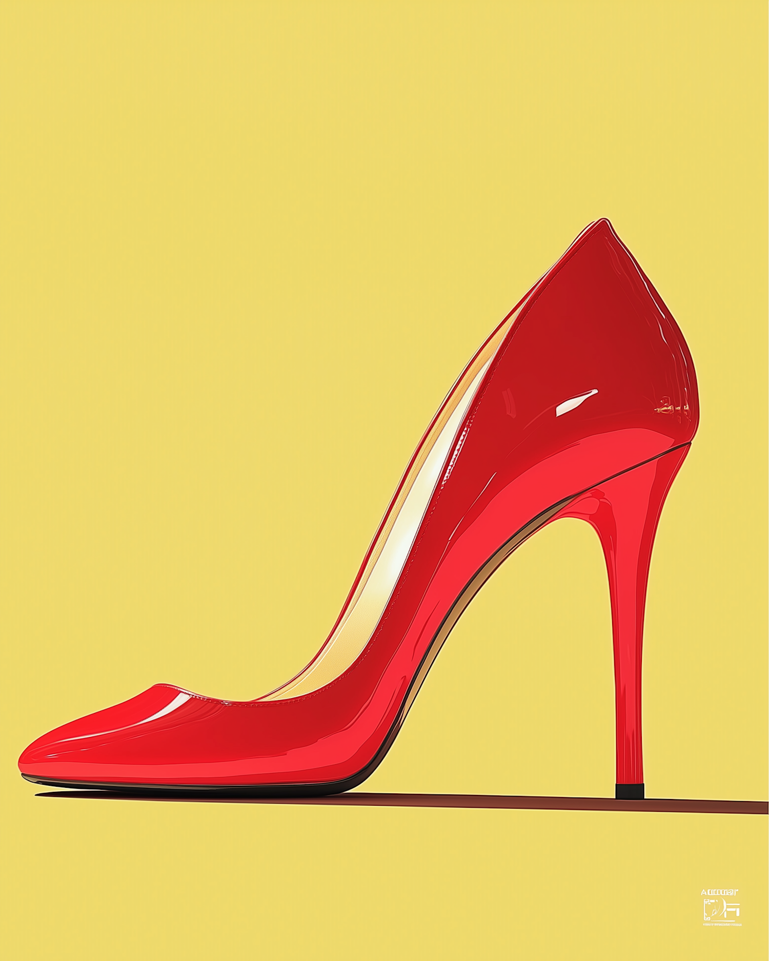 Illustration of a glossy red high-heeled shoe on a vibrant yellow background, showcasing sleek design and elegance.