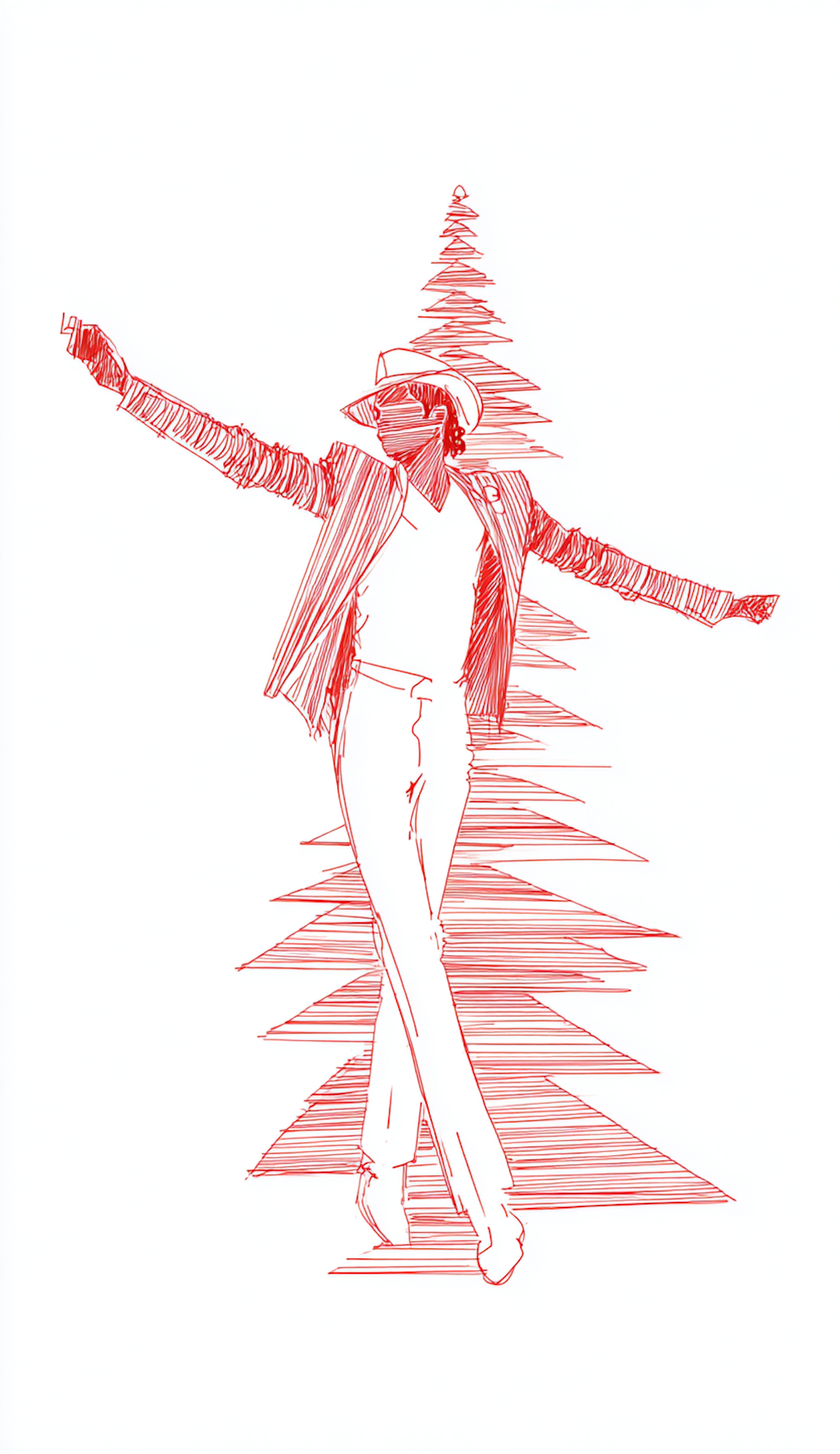 Illustration of a performer in a striking pose, drawn in bold red lines. A triangular background complements the figure.
