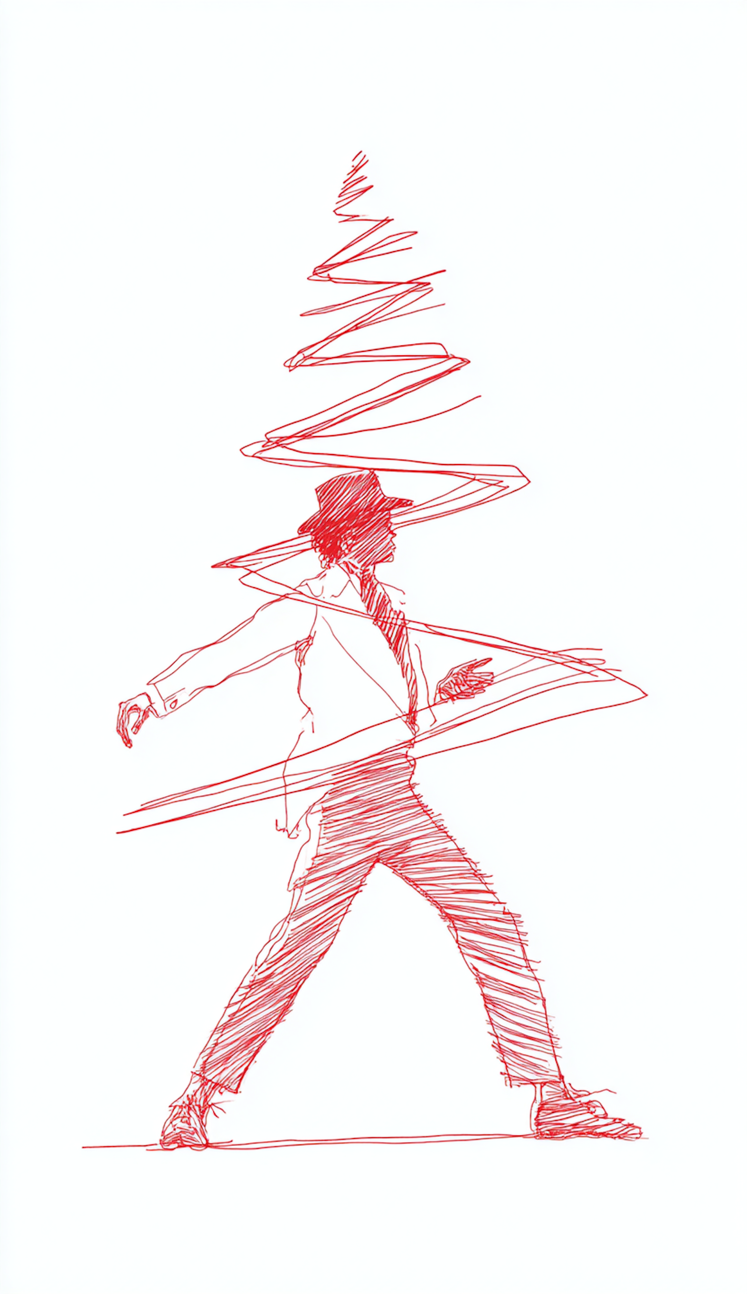 Minimalistic red line art of a stylish figure in motion with swirling patterns, capturing energy and elegance in a simple yet dynamic composition.