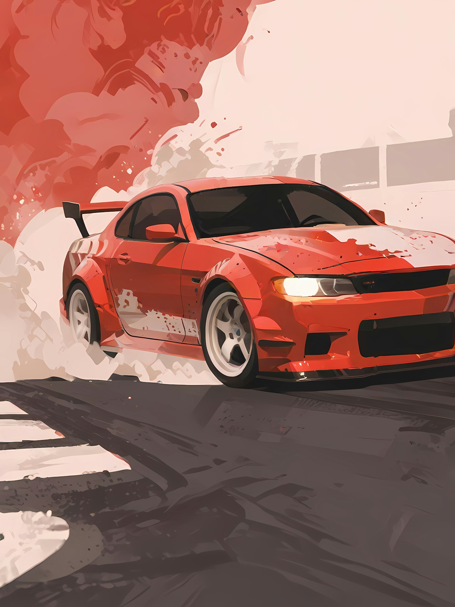 Red sports car drifting on a racetrack with smoke and skid marks, showcasing speed and precision in a dynamic illustration.