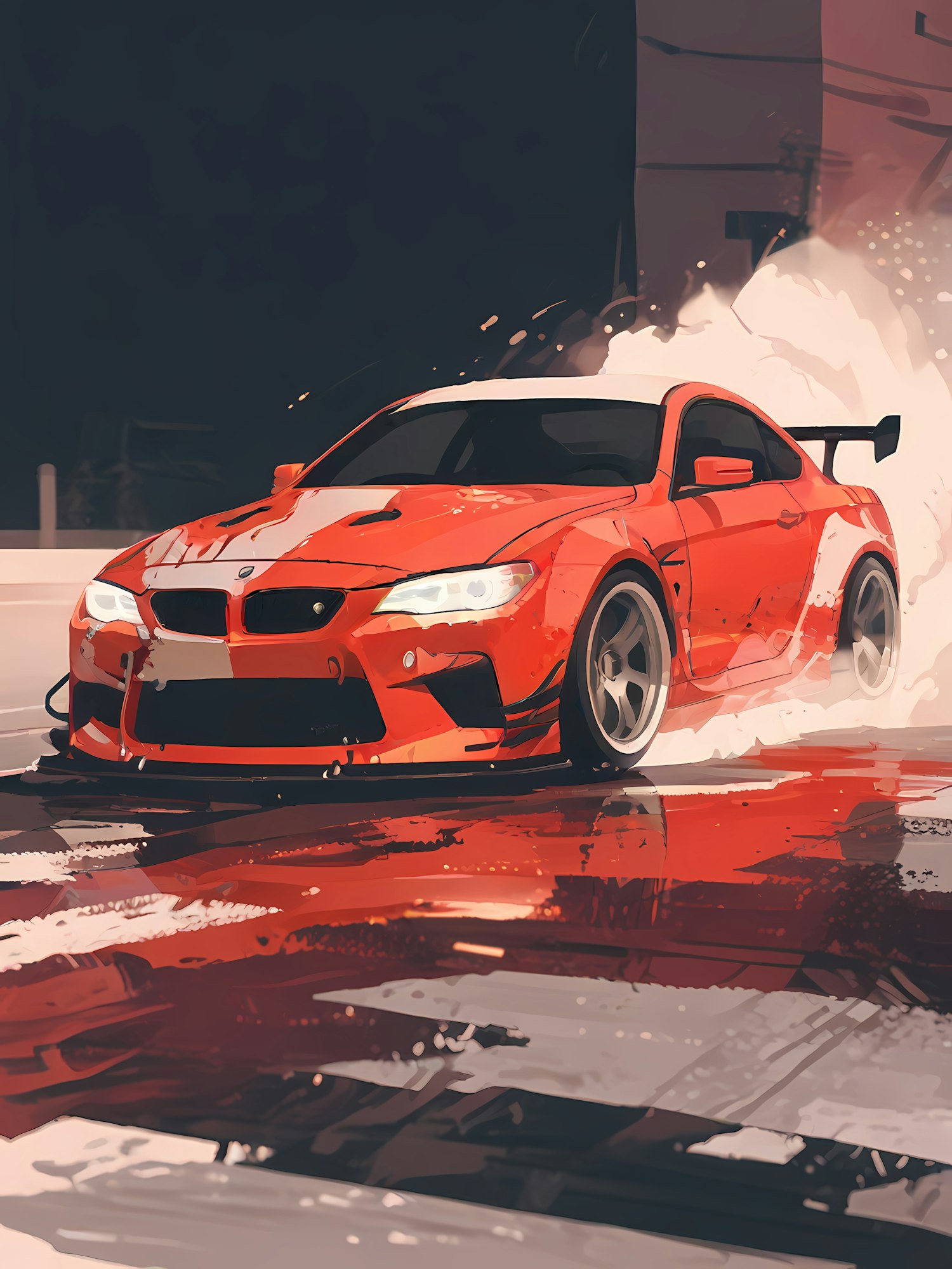 A red sports car drifts on a wet surface, spraying water dramatically. Its sleek design and glowing headlights stand out against a dark backdrop.