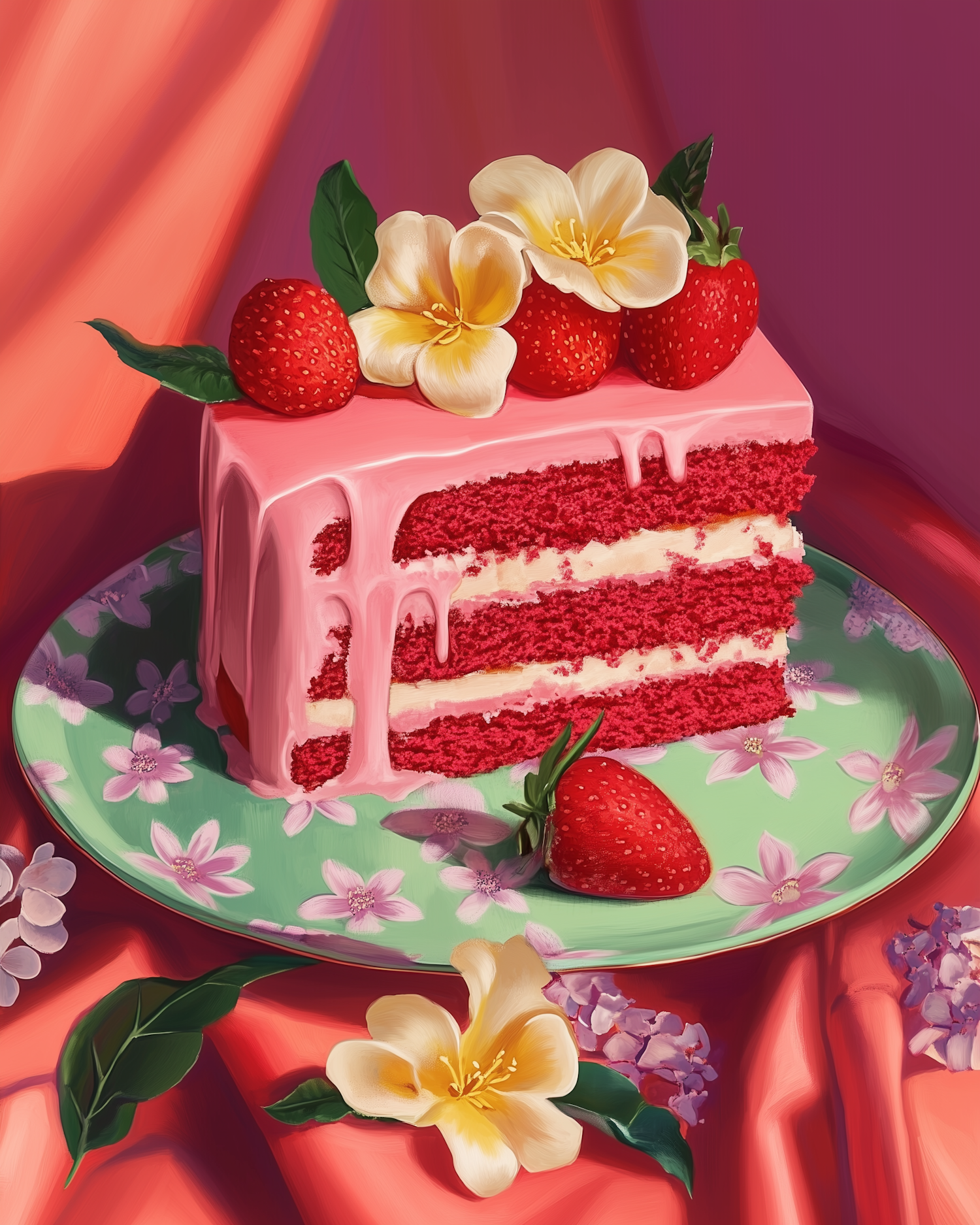 Illustration of a red velvet cake slice with pink icing, strawberries, and flowers on a floral plate against a red fabric background.