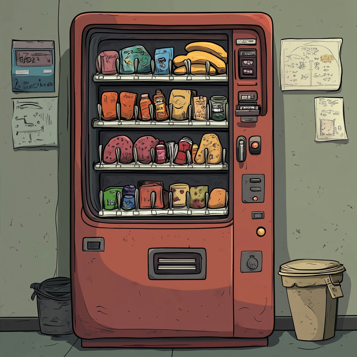A red vending machine stocked with snacks and drinks, set against a green wall with trash bins and notices nearby. Cozy and realistic vibe.