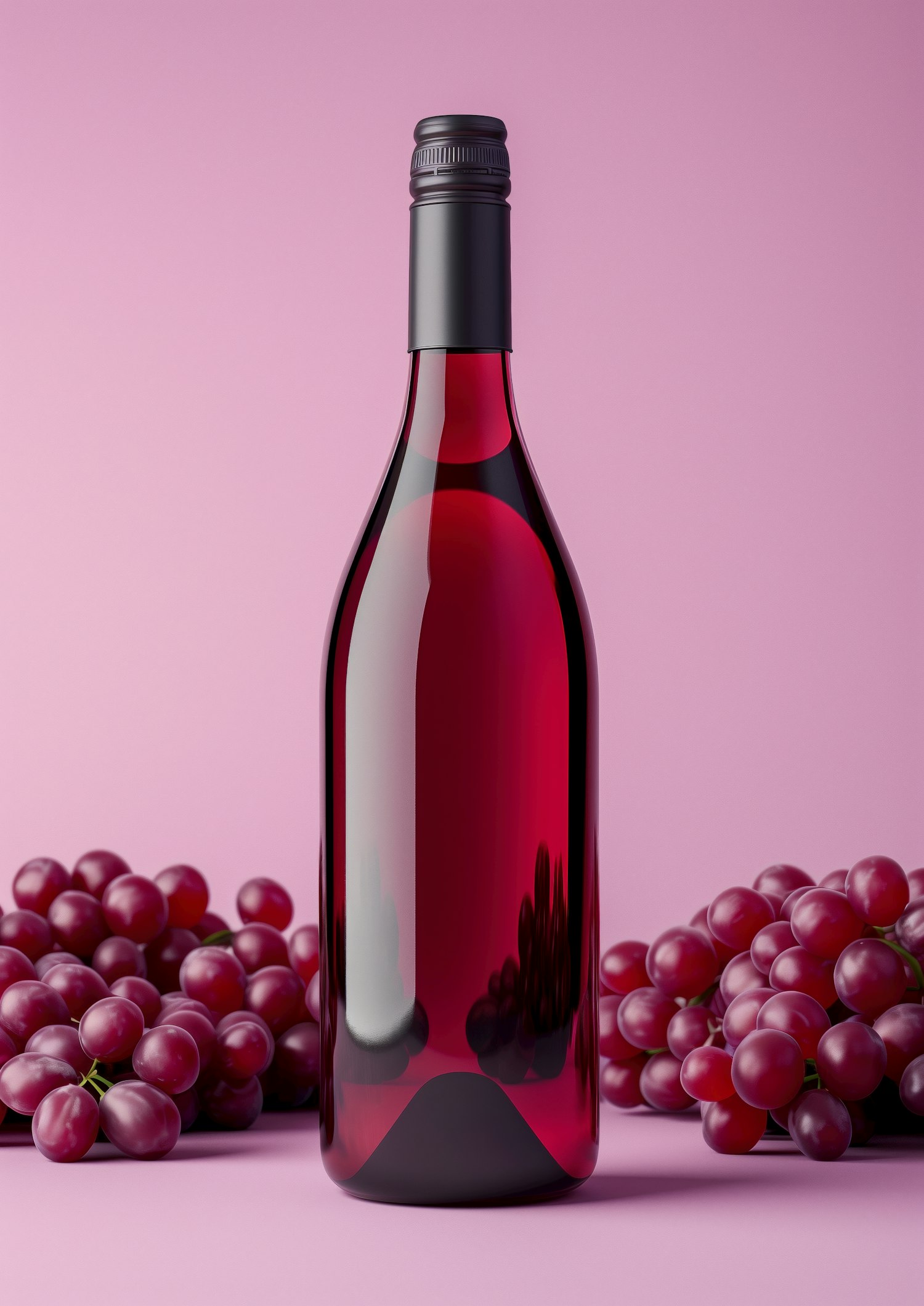 Elegant wine bottle with rich red wine and fresh grapes against a soft pink background, creating a luxurious and vibrant scene.