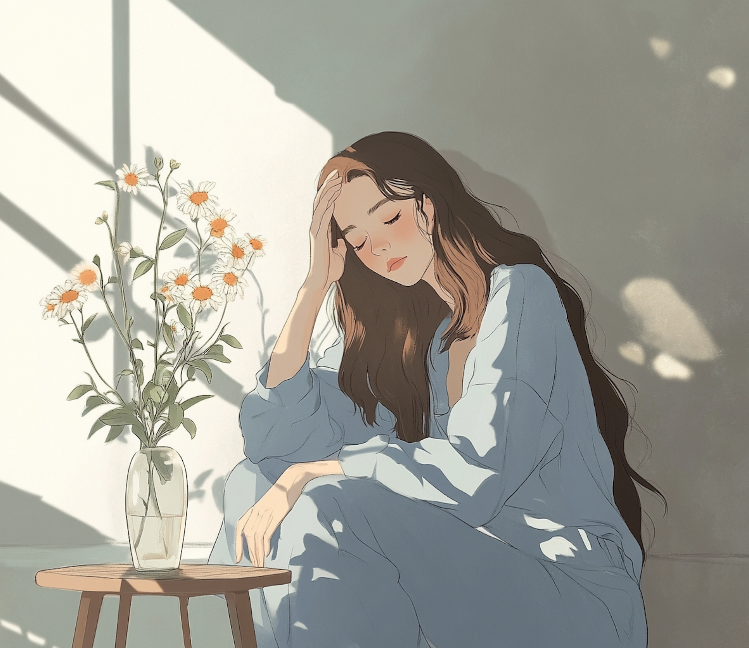 A peaceful illustration of a woman in light blue, resting beside a vase of flowers, with soft shadows creating a tranquil atmosphere.