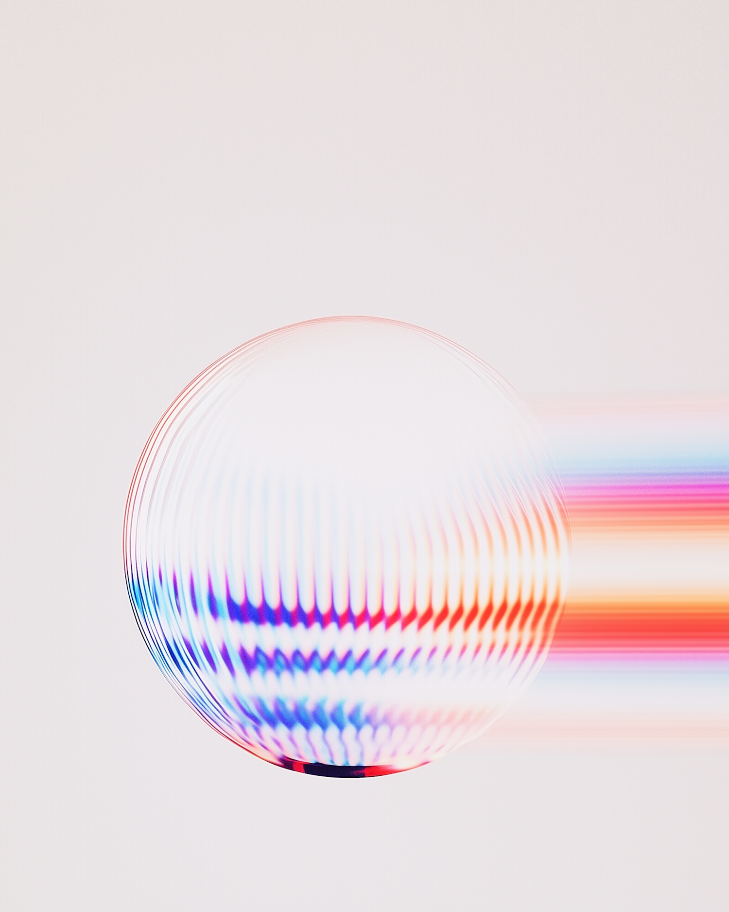 Abstract sphere with colorful wavy patterns and motion trail on a neutral background, creating a dynamic visual effect.