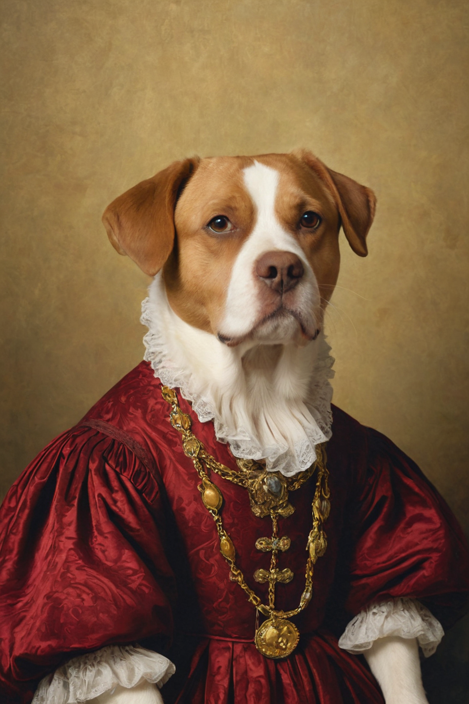 A noble-looking dog in a regal red outfit, complete with golden embellishments and lace trim, against a stately textured background.
