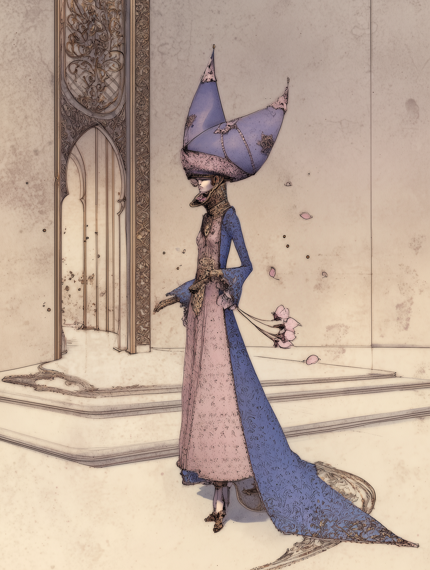 A stylized figure in a pastel gown and ornate headdress stands in an elegant setting, holding flowers with petals scattered around.
