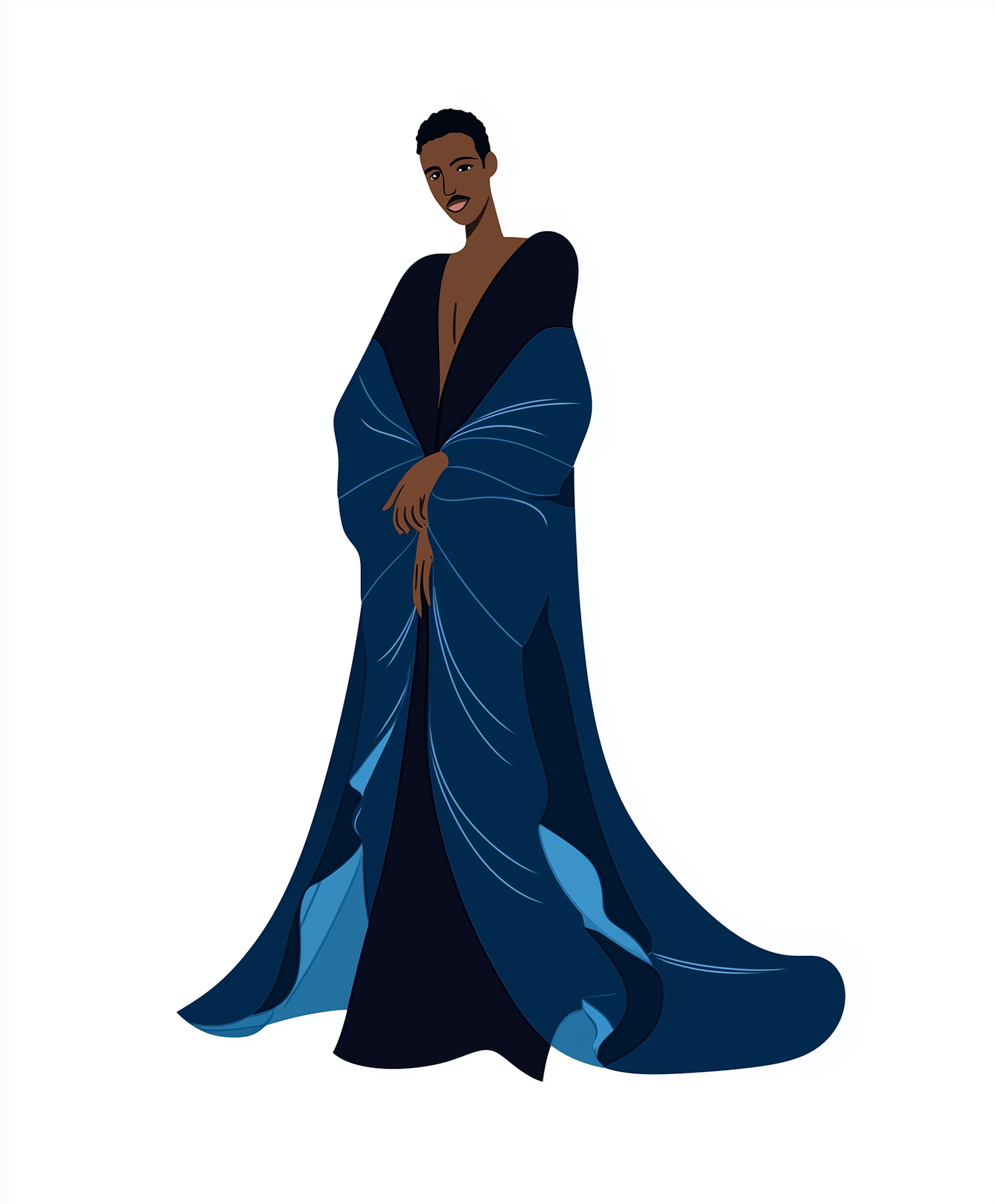 Elegant illustration of a person in a flowing dark blue robe, exuding confidence and poise against a minimalist white background.