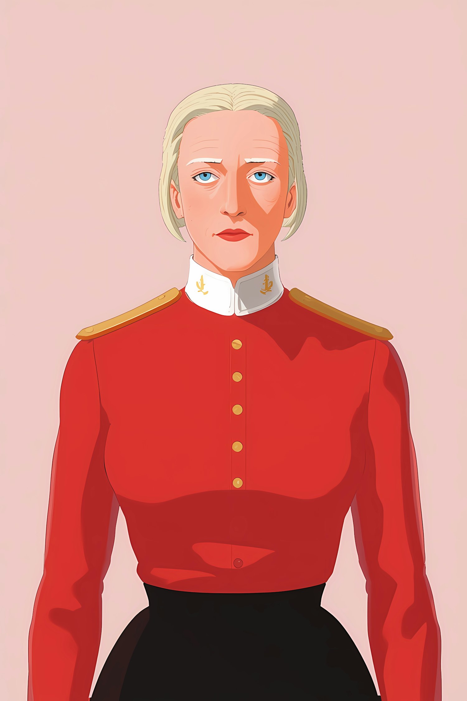 Stylized illustration of a person in a red military-style uniform with gold accents, set against a light pink background.