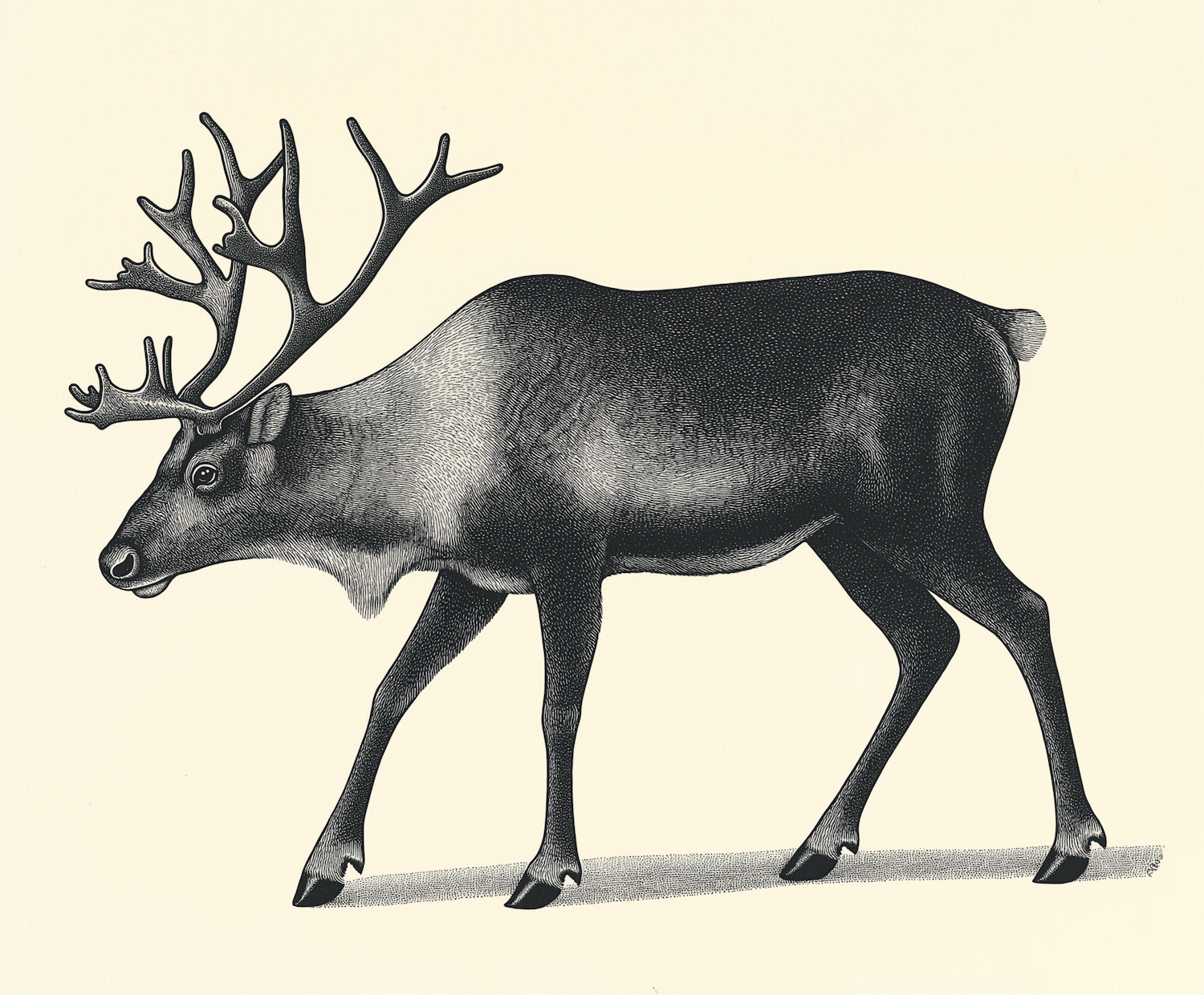 Detailed illustration of a reindeer with large antlers and a dark coat, set against a plain background.