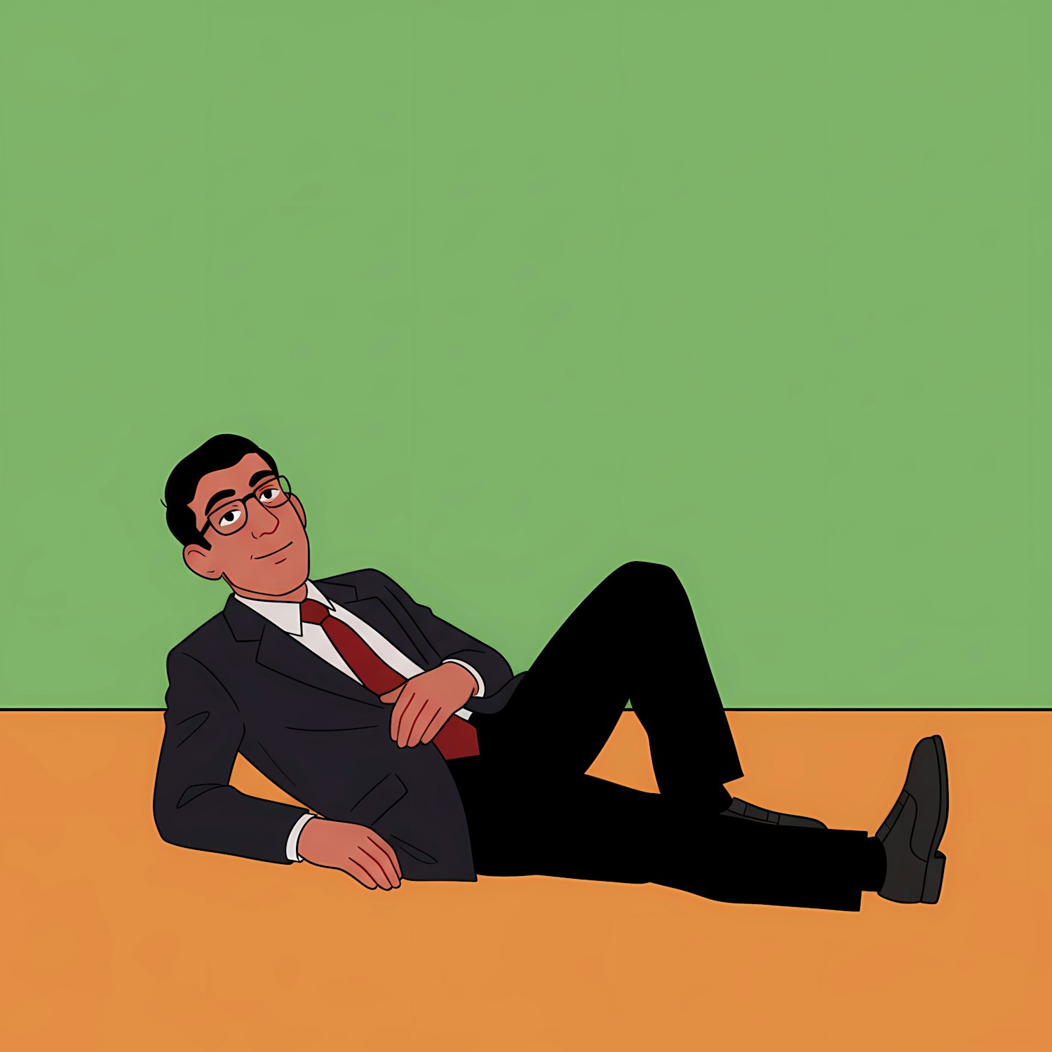 Cartoon illustration of a man in a suit reclining on an orange floor with a green background, exuding a relaxed and casual vibe.