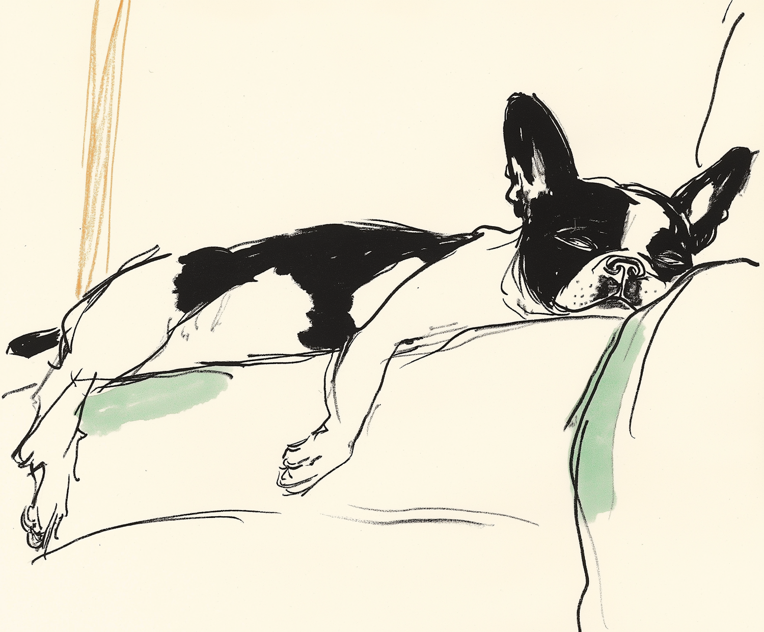 Illustration of a French Bulldog sleeping on a couch, featuring bold black lines and soft green and beige tones for a serene effect.
