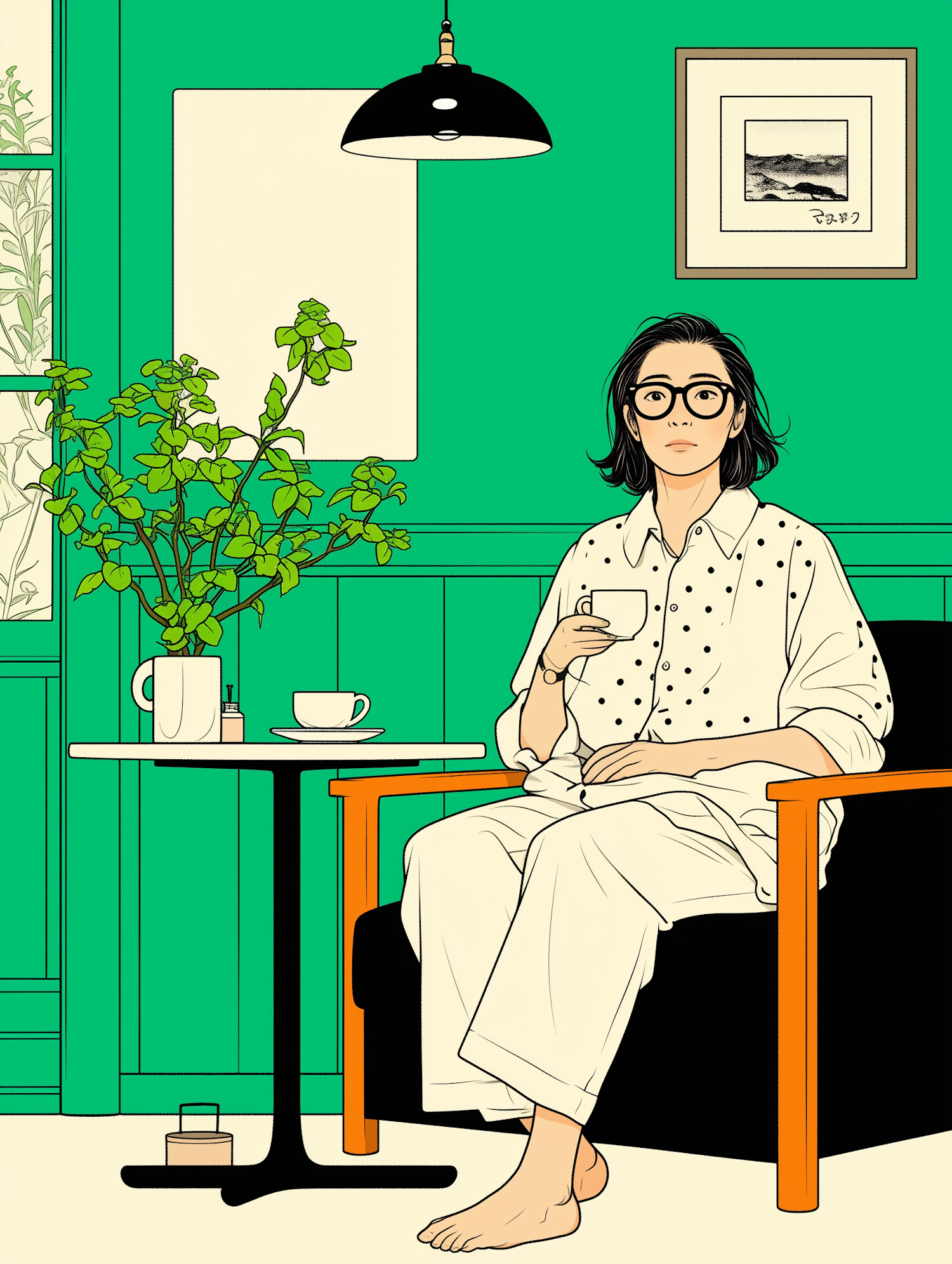 Illustration of a person in a modern room with green walls, sipping coffee. Features a potted plant and stylish decor.