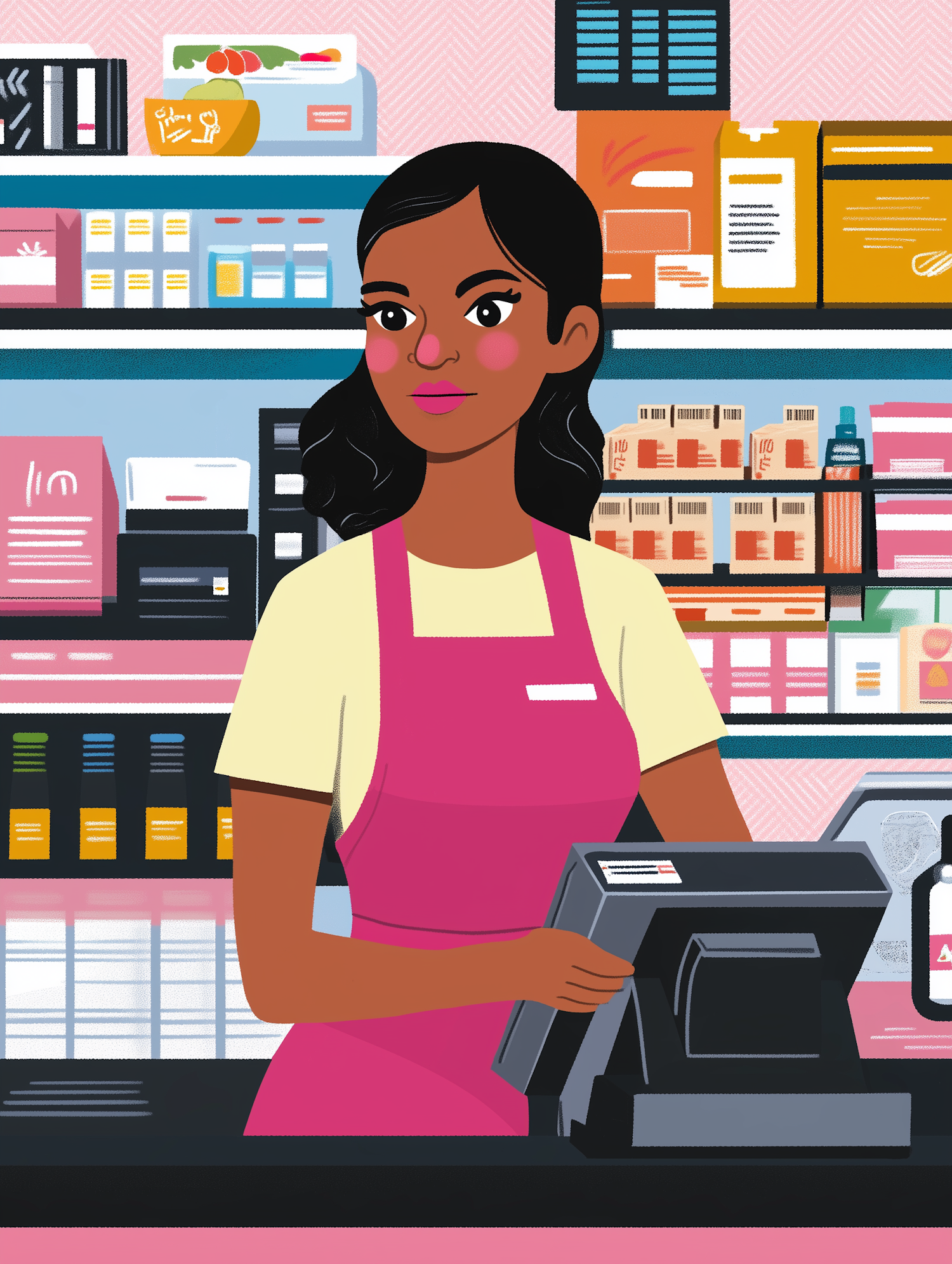 Cartoon illustration of a woman cashier in a pink apron at a store checkout, surrounded by colorful products.