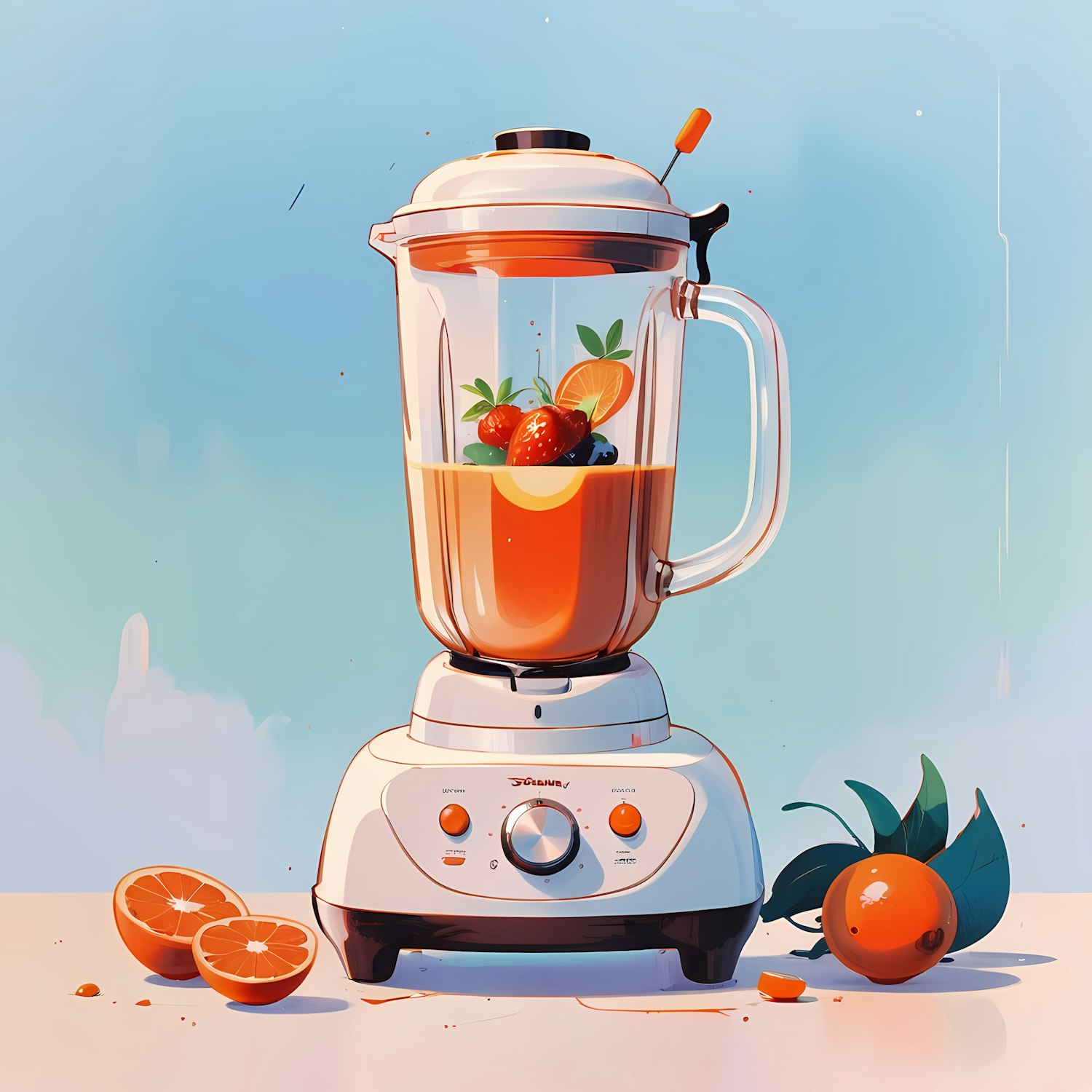 A retro-style blender blending a vibrant fruit smoothie, surrounded by fresh oranges and berries on a clean white surface.