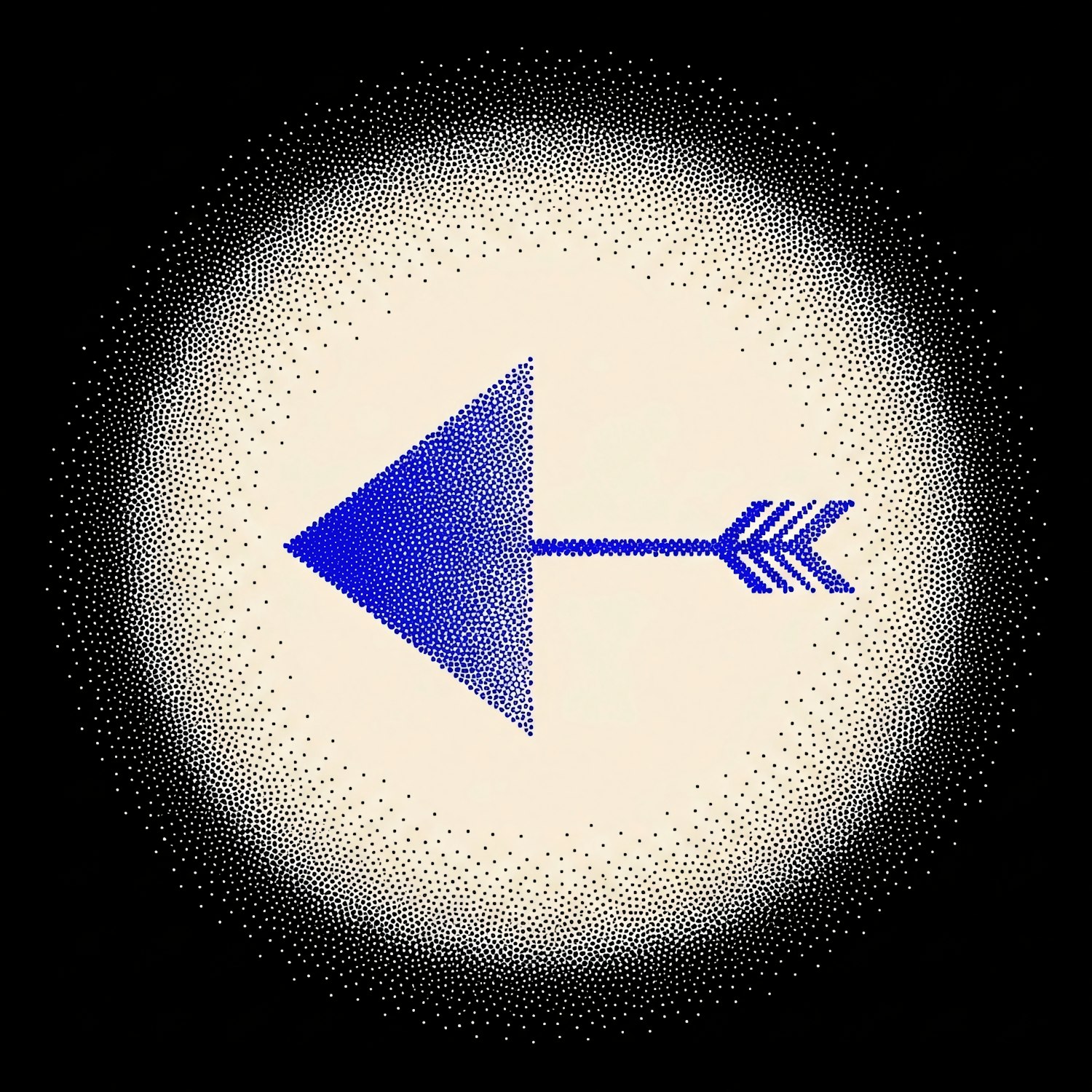 A retro-styled blue arrow graphic with a halftone dot pattern, set against a circular gradient background from beige to black.
