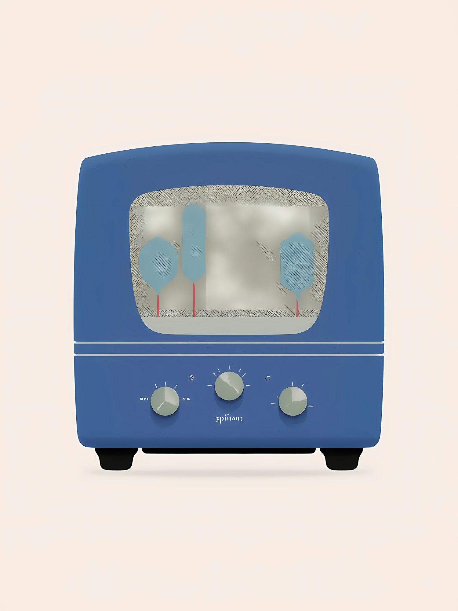 A retro-styled blue radio illustration with a clean design, featuring a mesh screen and three knobs, set against a beige background.