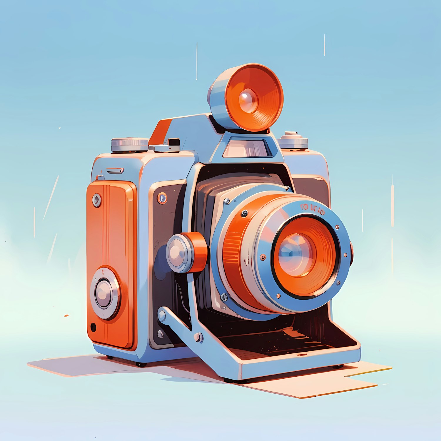 Stylish retro camera illustration with bold orange and blue tones, metallic accents, and a clean light blue background.