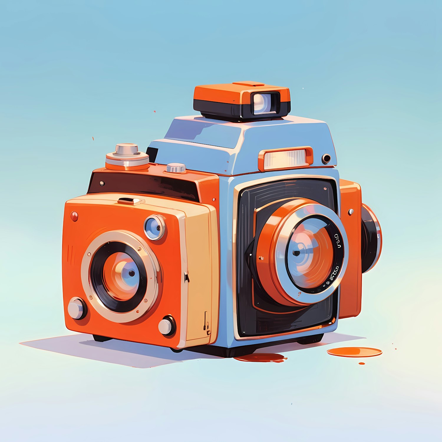 Stylized retro camera illustration in bold orange and blue tones, set against a clean gradient background with artistic details.