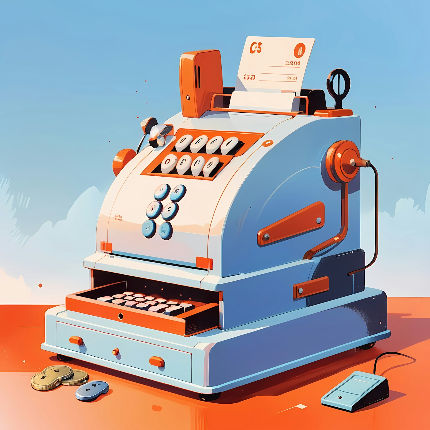 A colorful retro cash register illustration with playful details, open drawer, coins, and a modern twist. Perfect for vintage or nostalgic themes.