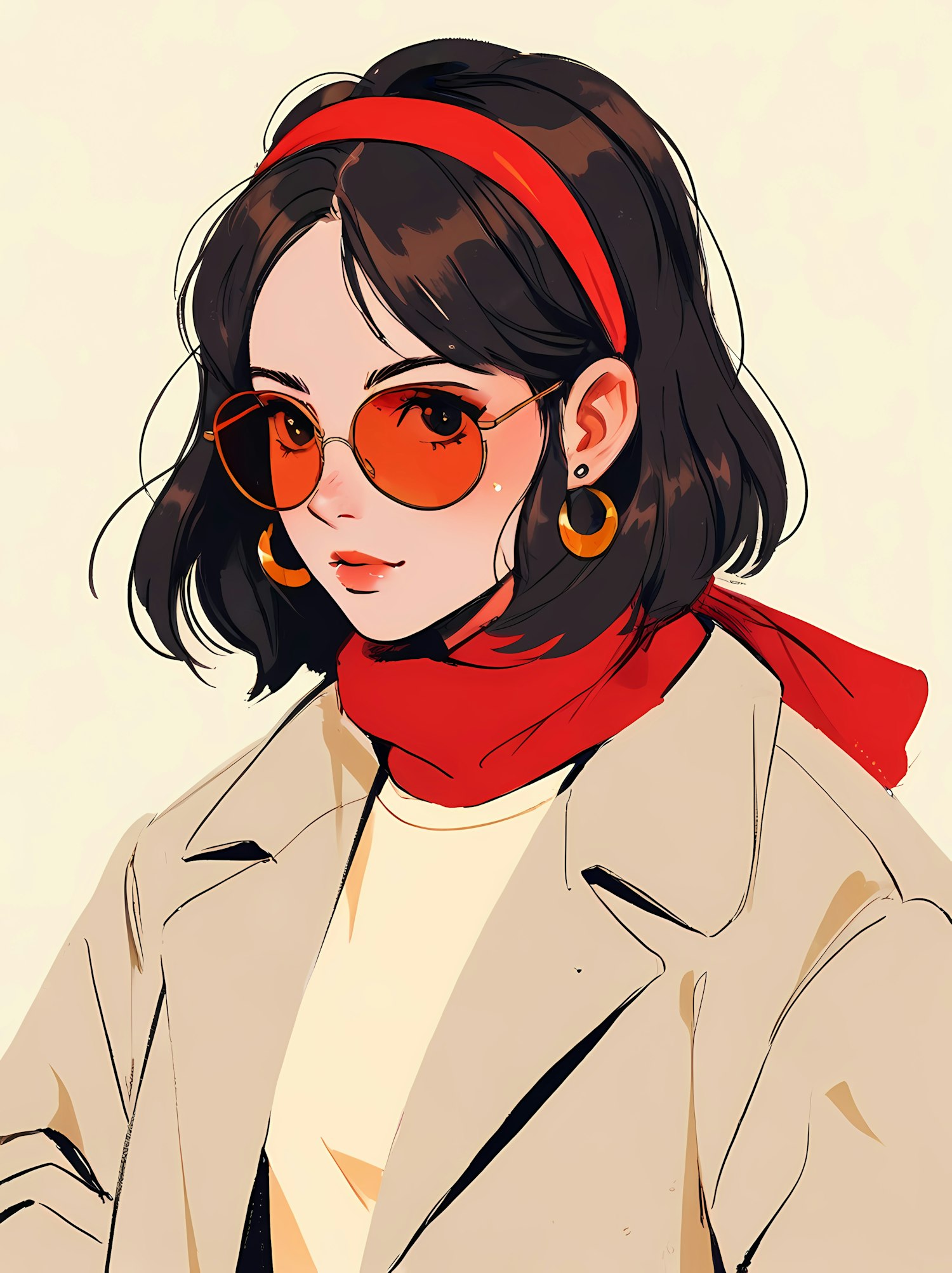 Stylish illustration of a woman with red accents, orange sunglasses, and a beige trench coat, exuding retro chic vibes.