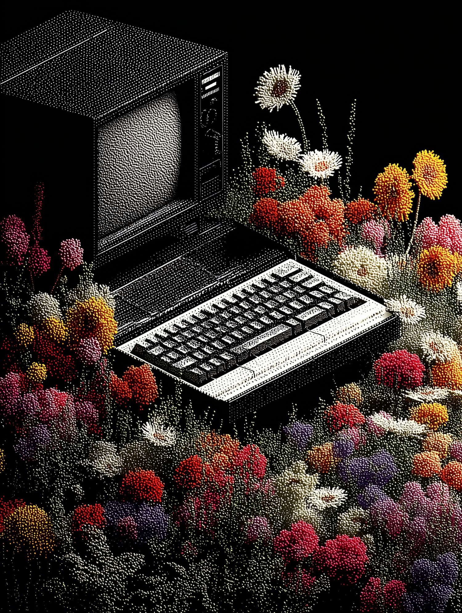 A retro computer surrounded by vibrant flowers, blending technology and nature in a surreal artistic composition.