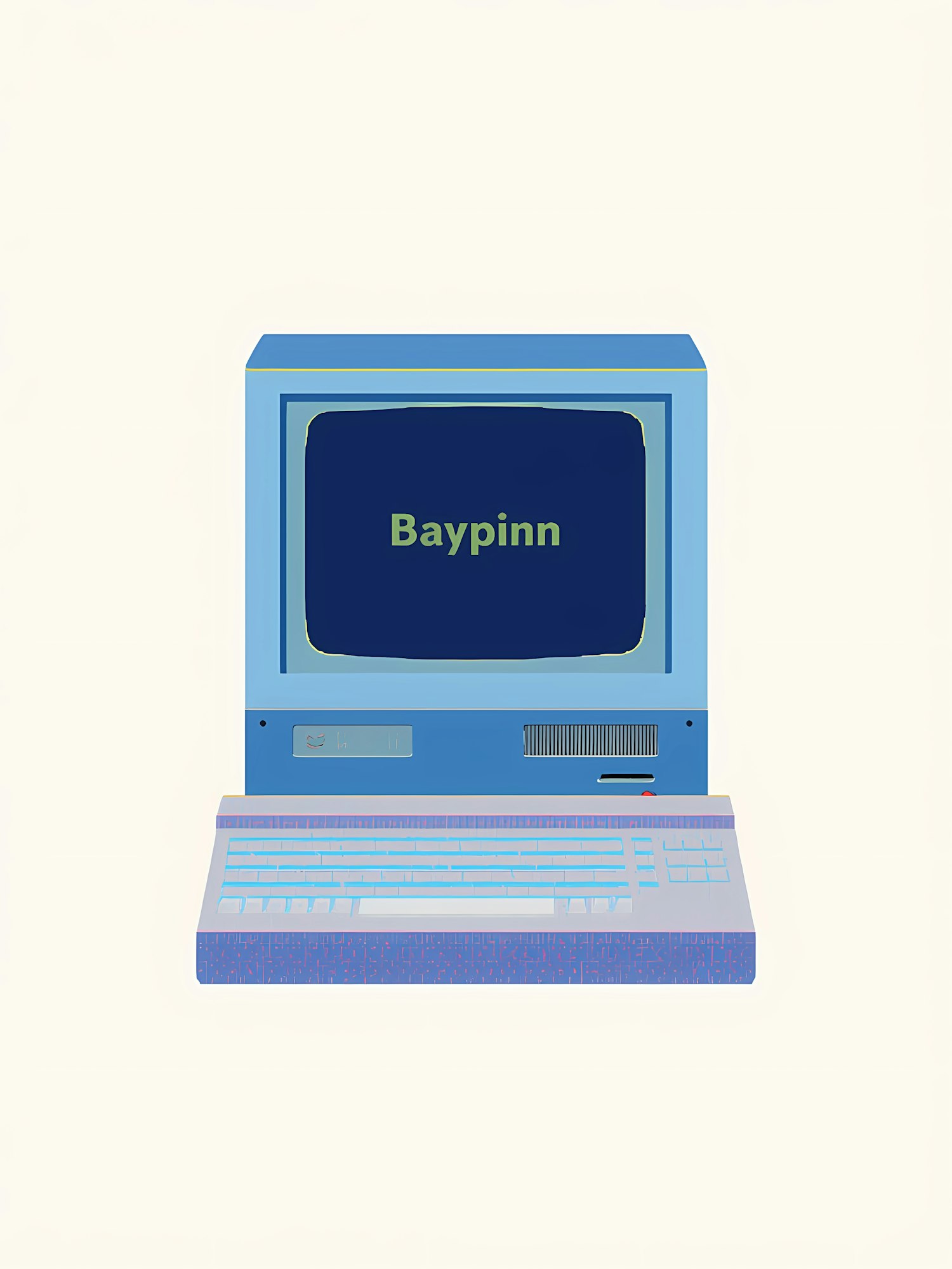 Retro computer illustration with a CRT monitor displaying 'Baypinn' in green, set against a minimalist beige background.