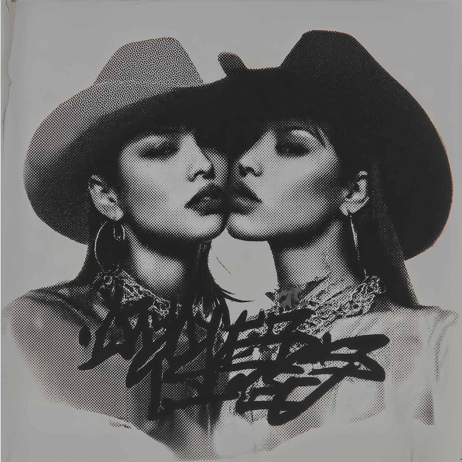 Stylized black-and-white artwork of two women in cowboy hats with graffiti overlay, blending retro halftone aesthetics with modern urban art.