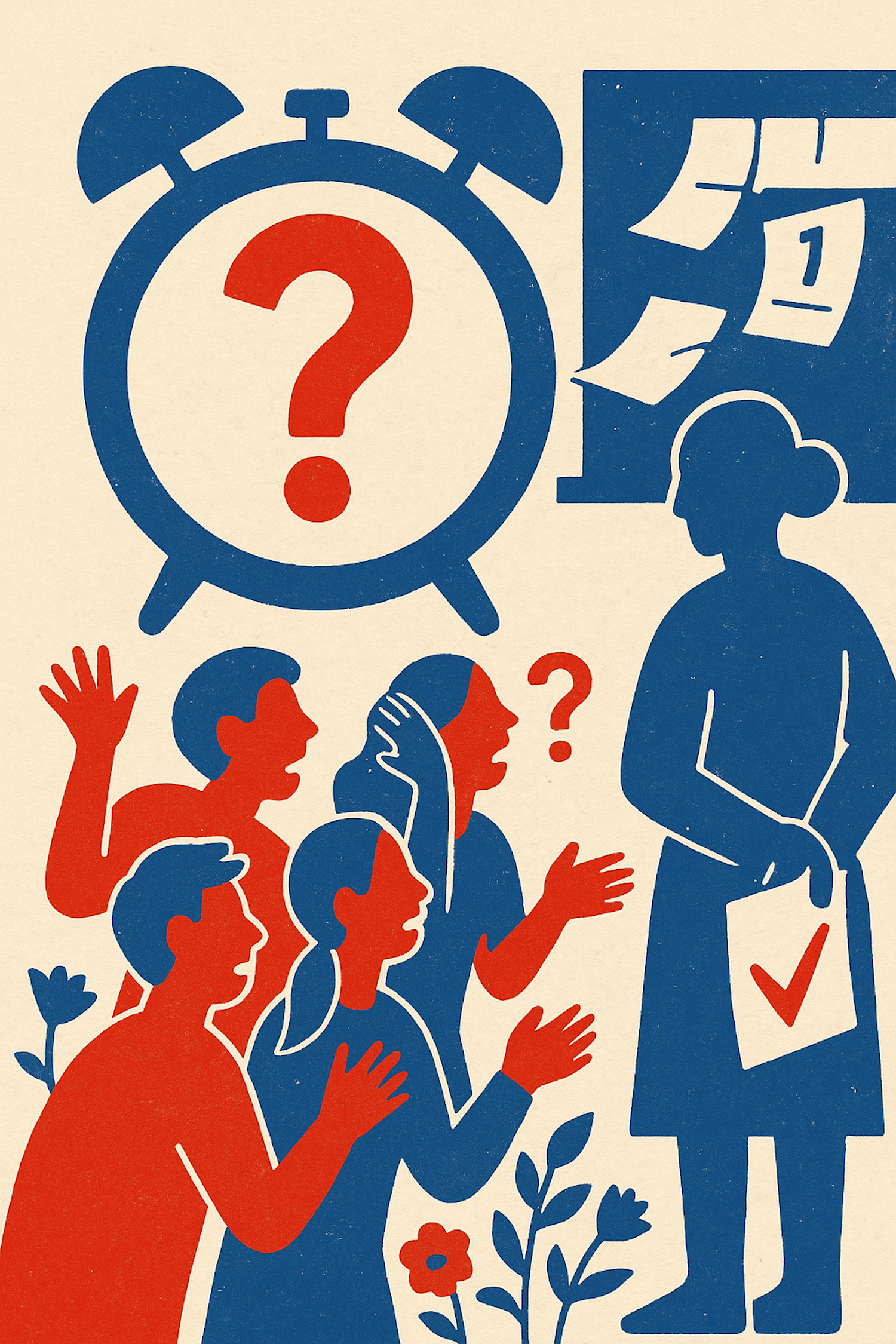 Retro-style illustration of people seeking answers, featuring a clock with a question mark and a woman holding a paper with a checkmark.