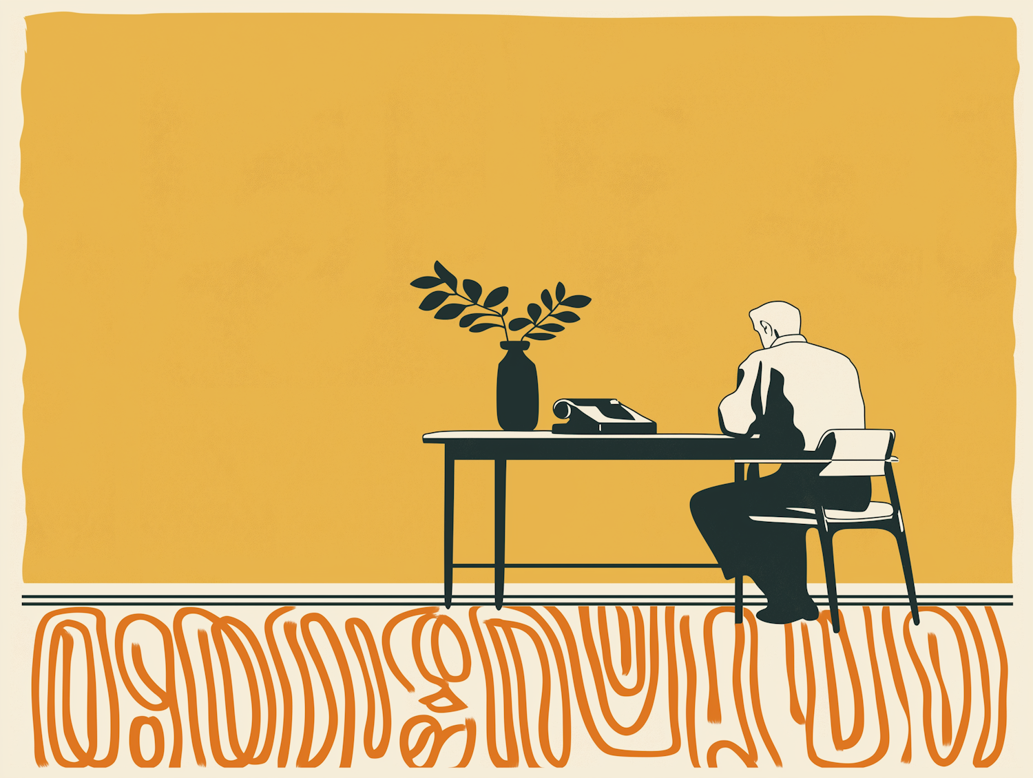 Minimalist illustration of a man at a desk with a vase and phone, set against a mustard yellow background and abstract orange floor pattern.