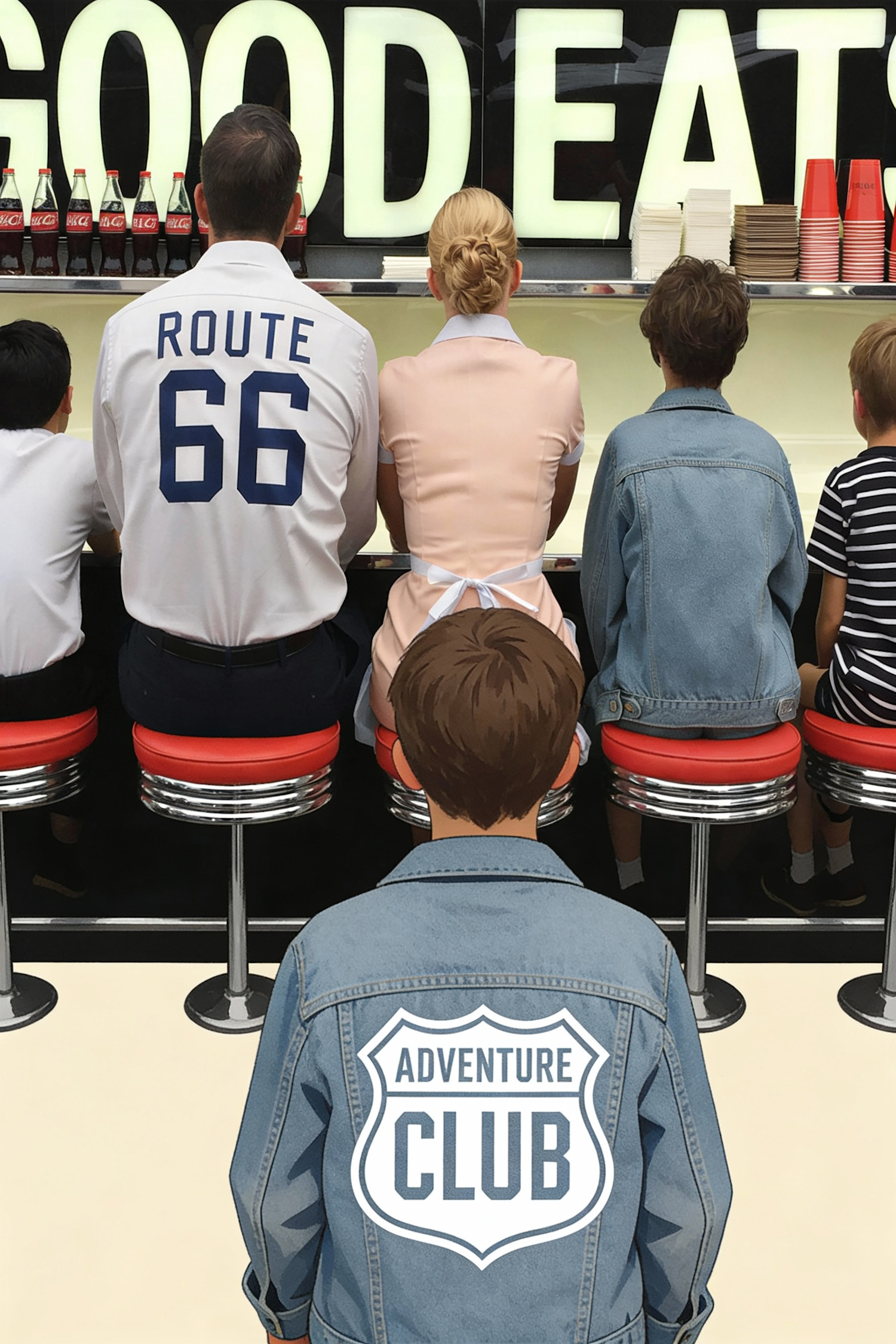 A nostalgic diner scene with retro stools, a 'Route 66' shirt, and a 'GOOD EATS' sign, capturing a classic American vibe.