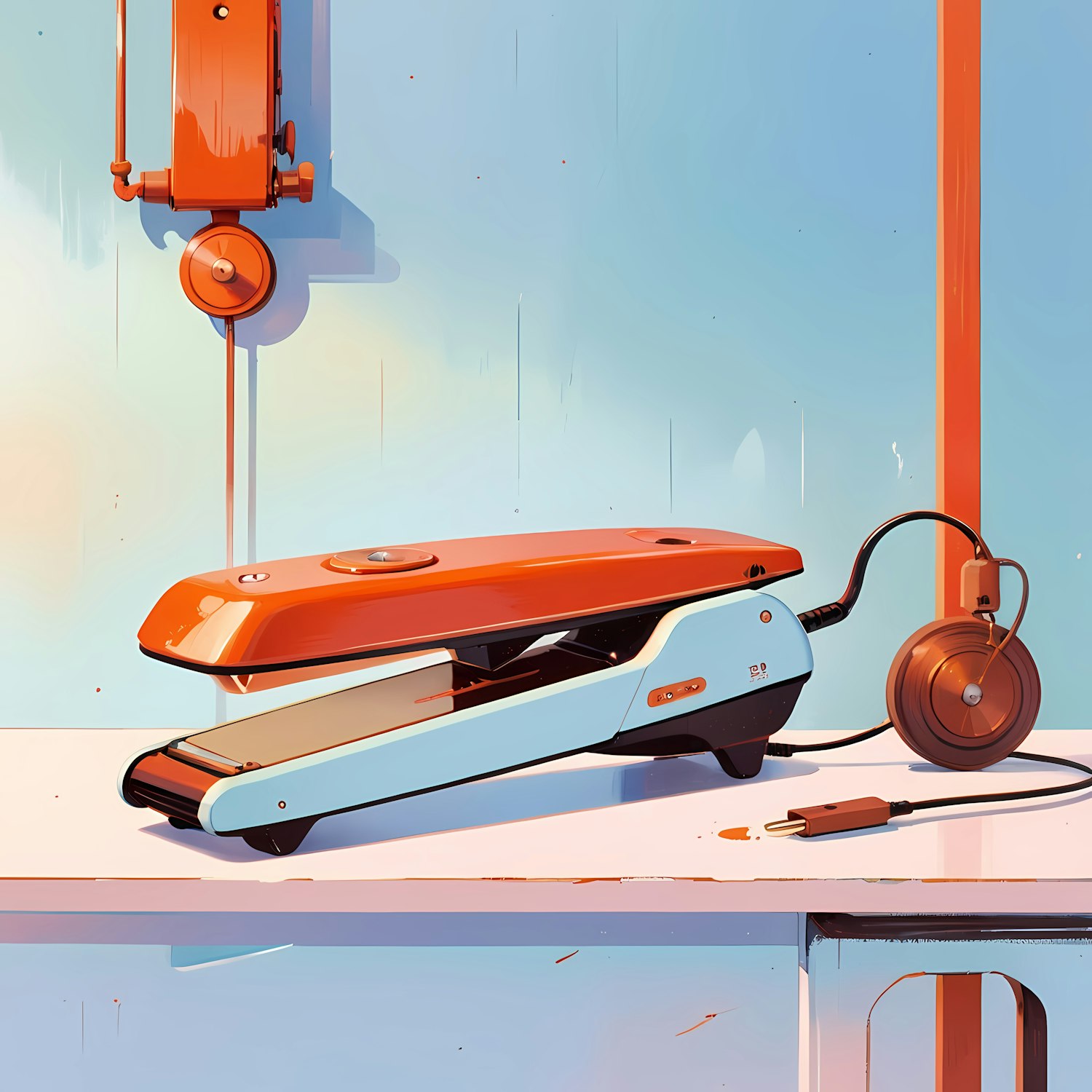 Retro-inspired electric stapler with orange and blue design, sleek power cord, and wall-mounted reel in a minimalist setting.