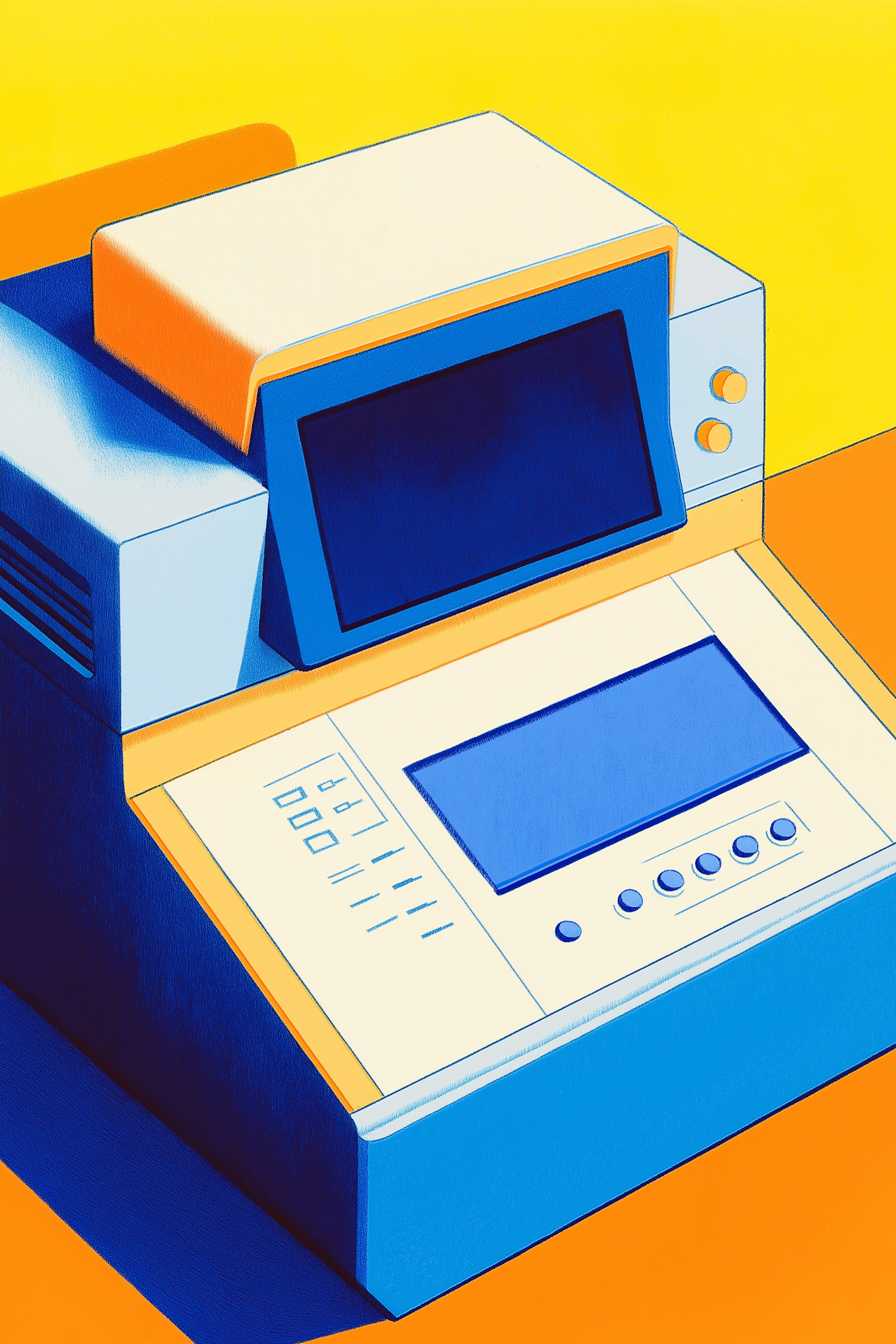 Stylized illustration of a retro electronic device with bold colors and a modern aesthetic, featuring a blue screen and control panel.