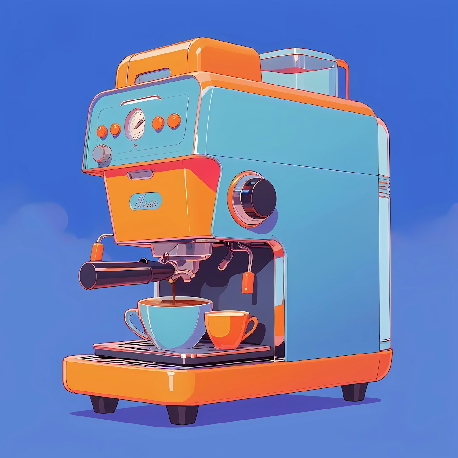 Vibrant retro-style espresso machine in orange and blue, pouring espresso into matching cups. Sleek, modern design with nostalgic charm.