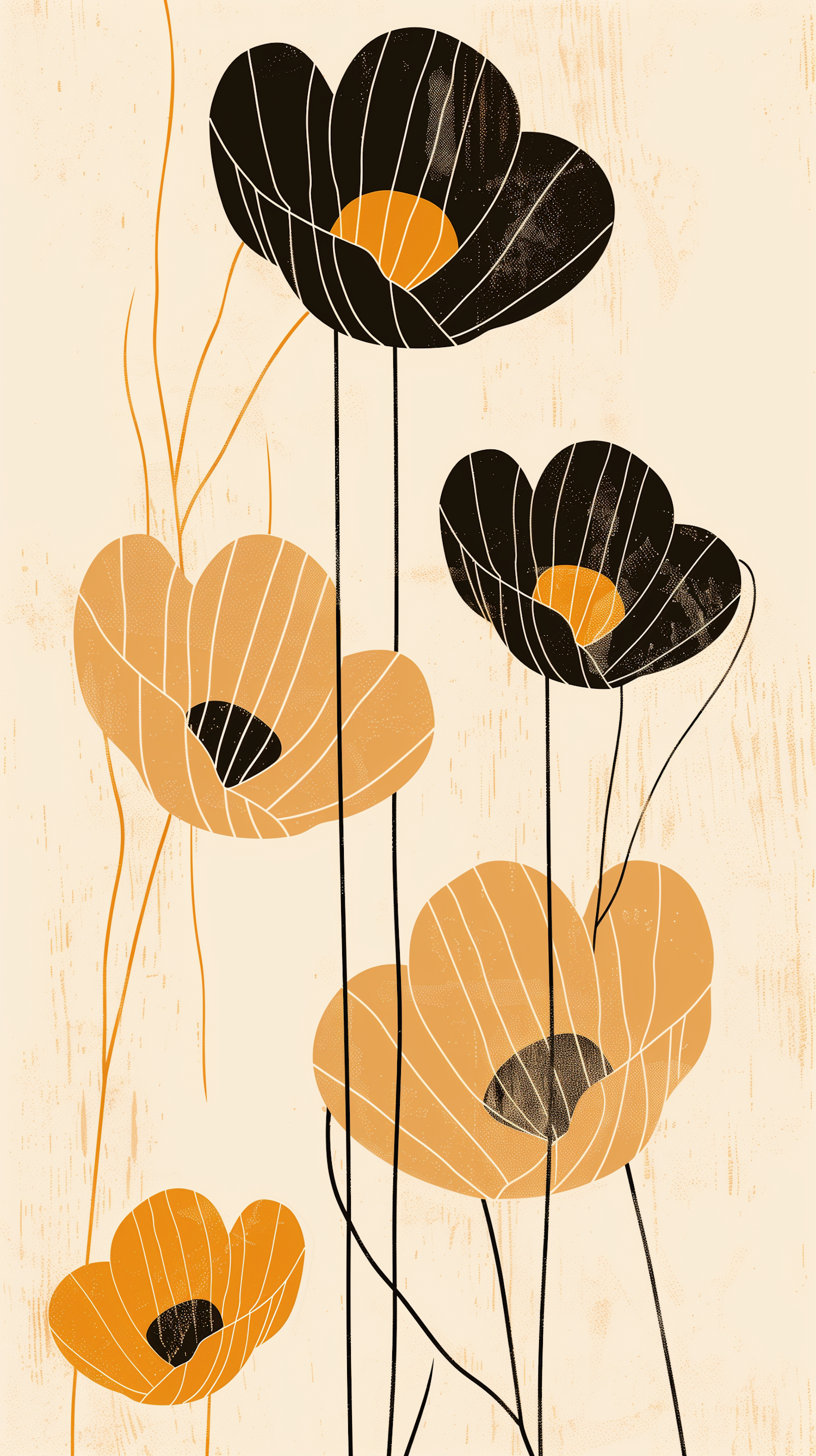 Minimalist retro floral illustration with black and orange flowers on a beige textured background, featuring clean lines and vintage charm.