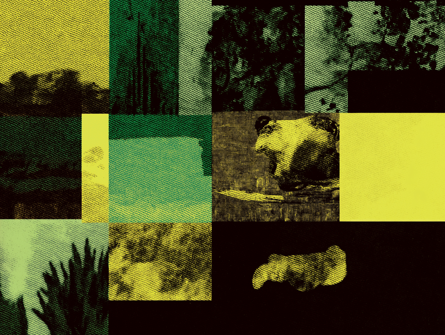A bold collage of green, yellow, and black textures featuring abstract trees, foliage, and a halftone-style frog for a retro artistic vibe.