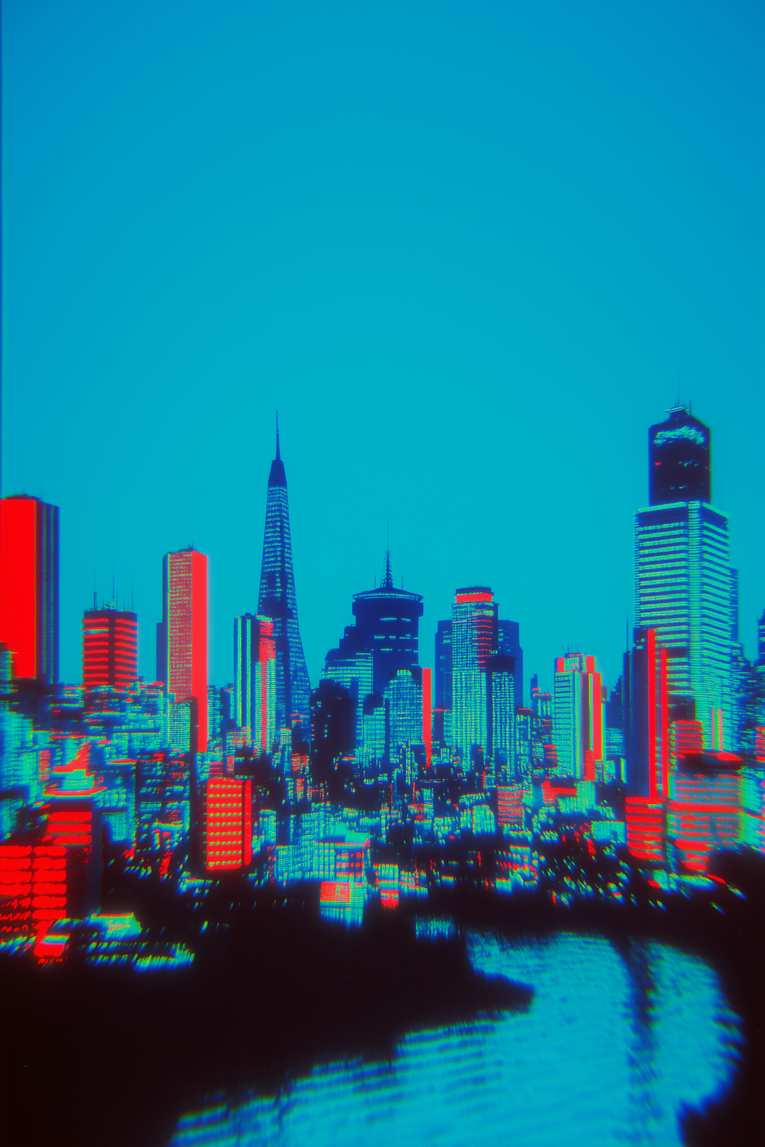 A neon cityscape with glitch art effects, showcasing a futuristic skyline with vibrant blue and red tones and a reflective water foreground.