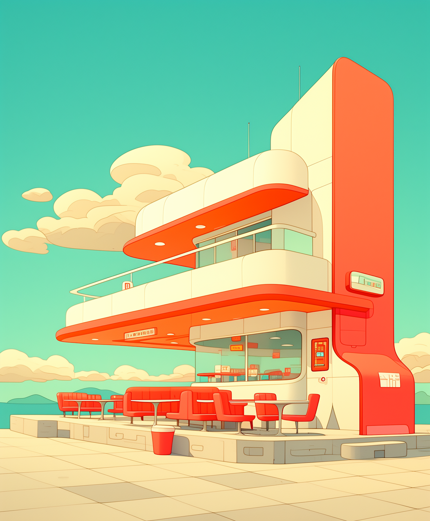 Futuristic diner with retro design, vibrant orange and white colors, and outdoor seating under a clear turquoise sky.