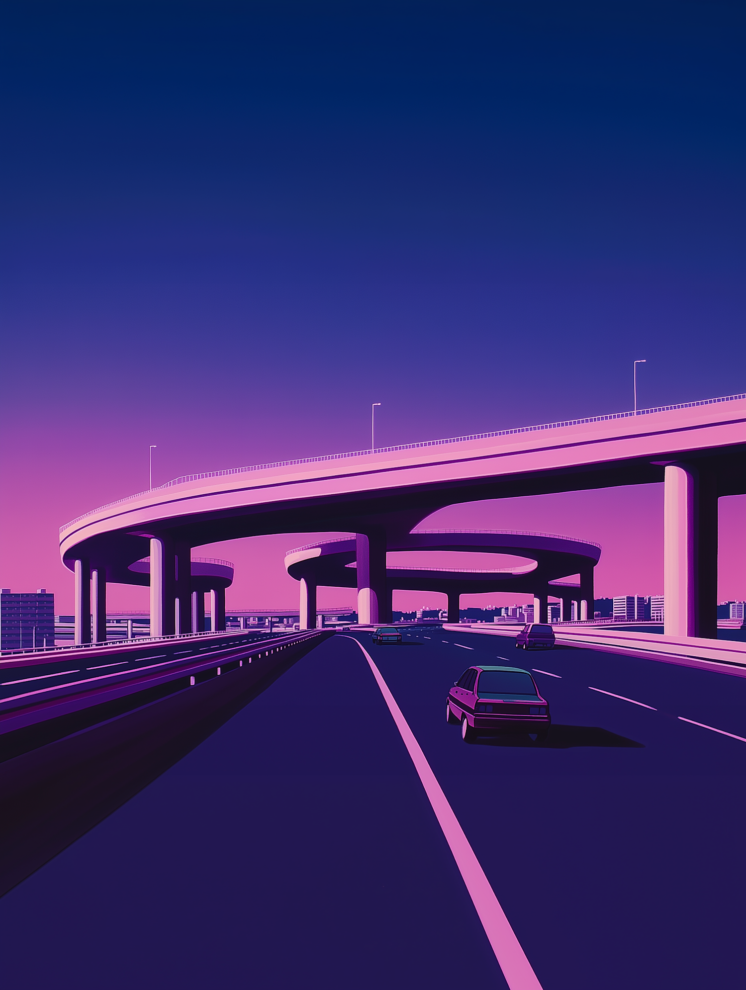 Retro-futuristic highway illustration with vibrant pink and blue hues, curving overpasses, and minimalistic cityscape in the background.