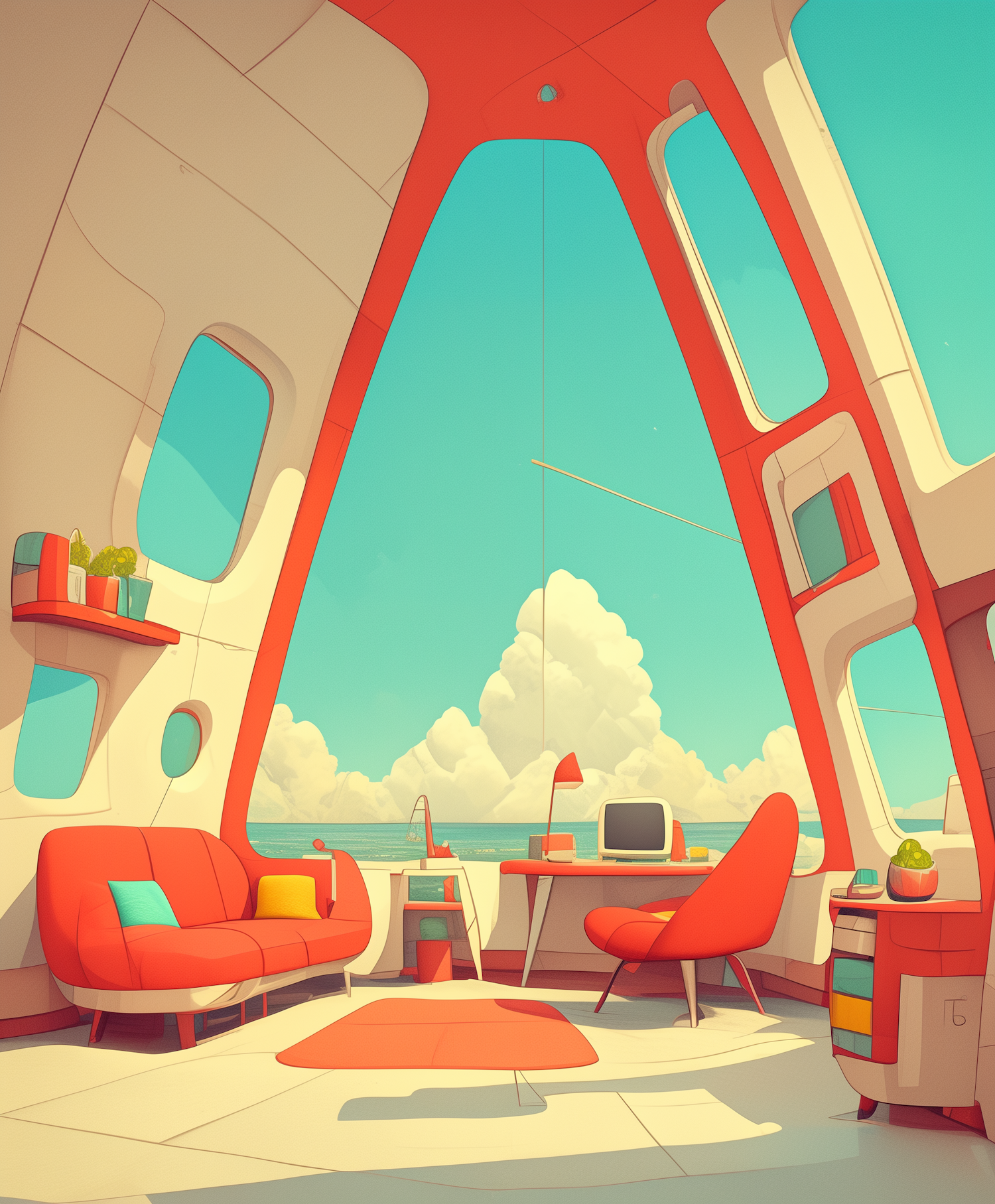 Retro-futuristic room with vibrant red furniture, large windows, and a vintage computer, set against a bright sky with fluffy clouds.