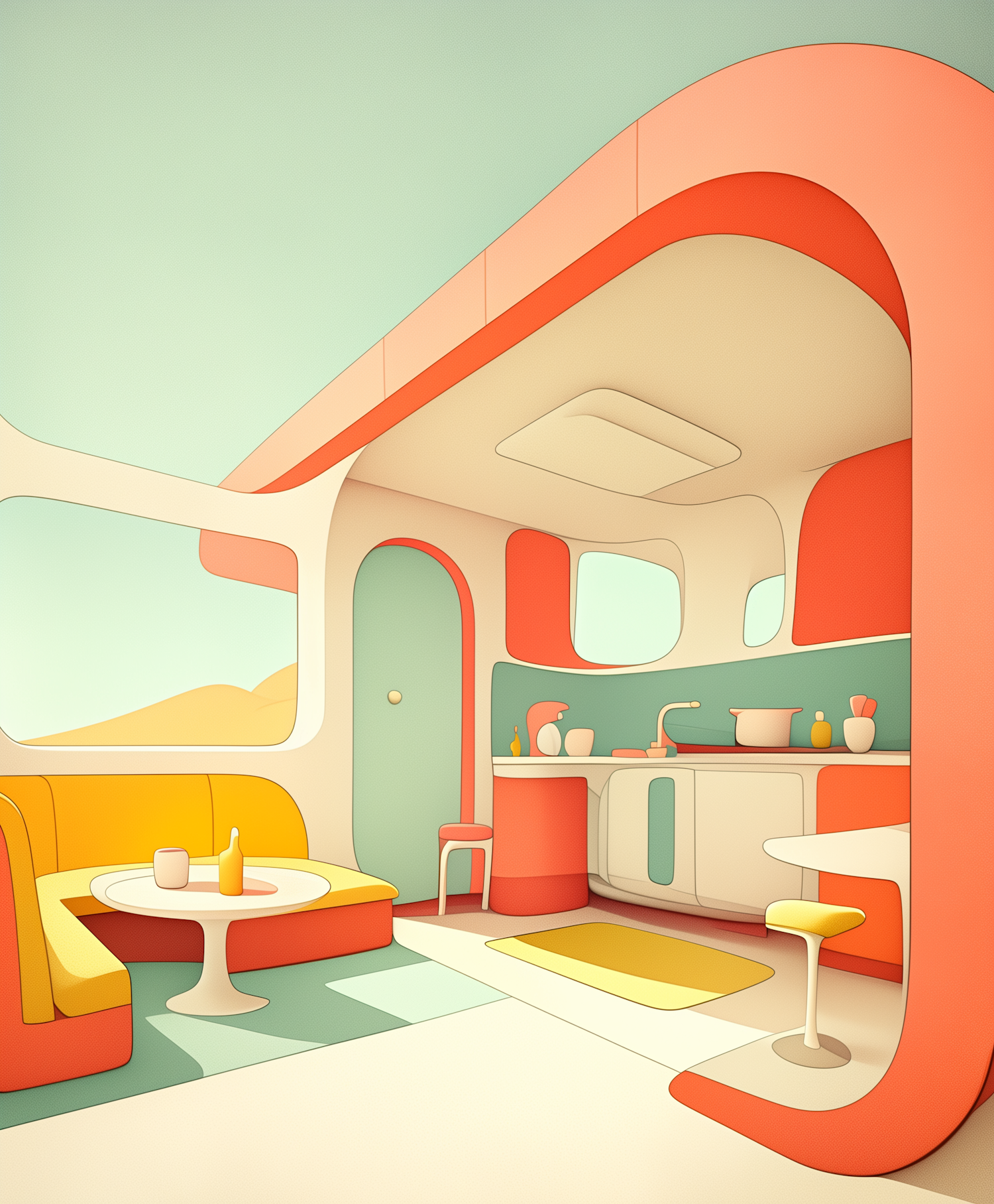 Retro-futuristic kitchen with vibrant colors, rounded edges, and minimalist design. Features a cozy dining nook and ample natural light.