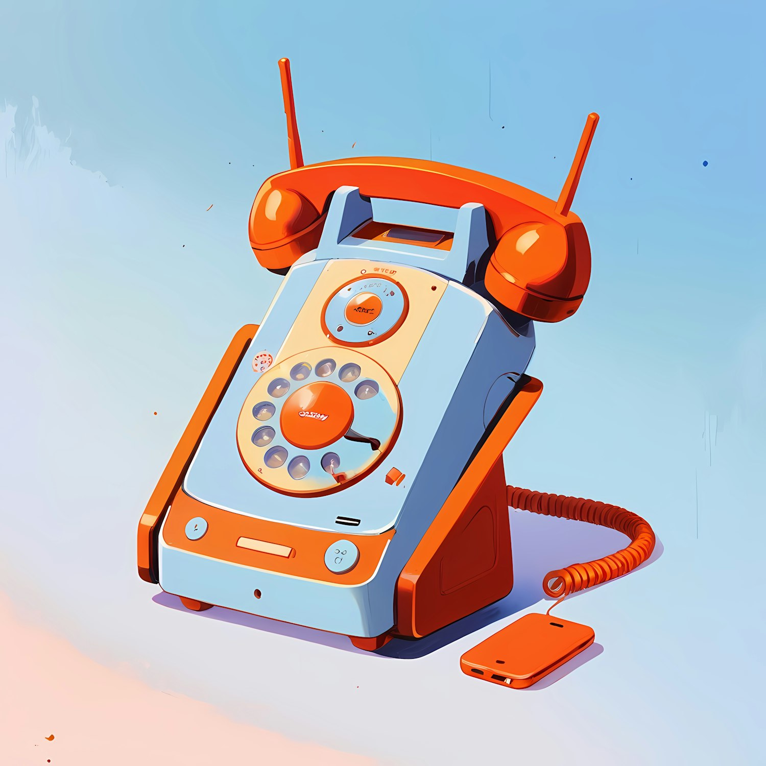 Retro rotary phone in orange and blue with a modern twist, featuring antennae and a connected smartphone-like device. Fun and nostalgic design.